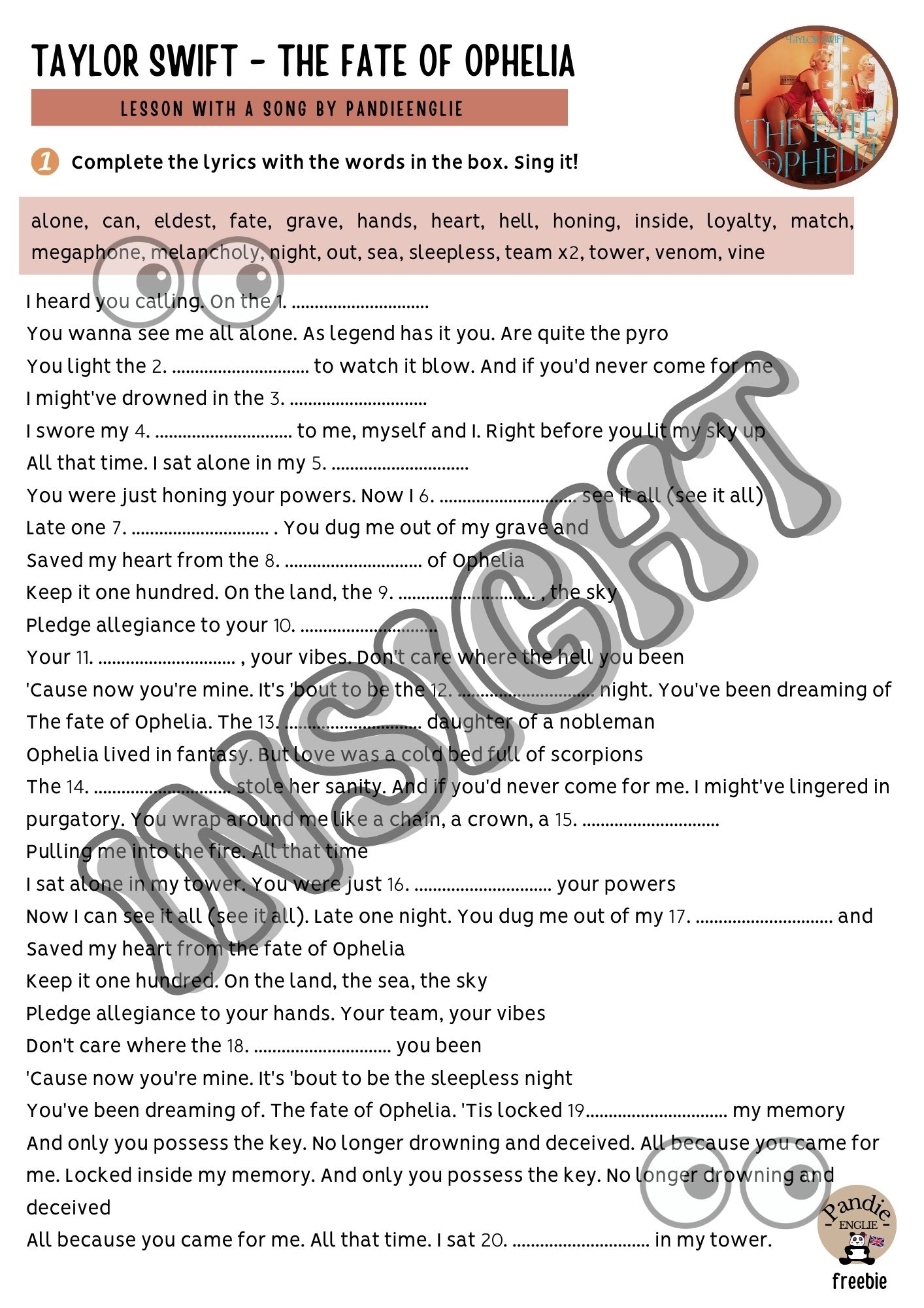In this series you will find exercises based on songs and their lyrics. First, the students have to listen to the song once, twice or three times - how many times they need to complete the lyrics. After that, they try to translate some lines from the text. Encourage them to be more creative than translating only word-for-word ;) Then they have to solve a crossword with the words from the song. After that, they complete some sentences with the gaps - the words are also from the song. The final exercise is extra task which is focused on matching the verbs. This worksheet is for Polish students.