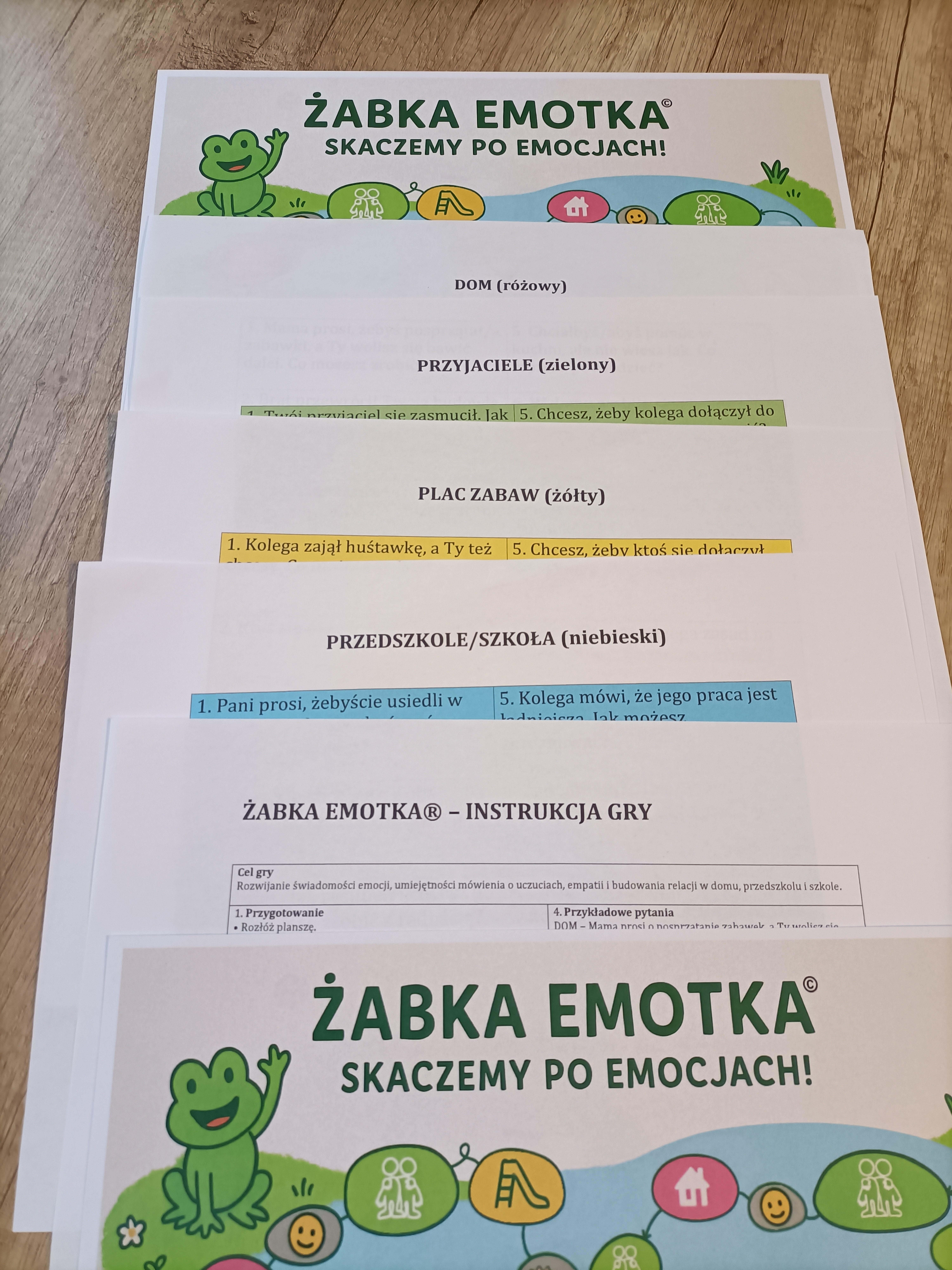 Zawartość: plansza A4 (zalecany druk na wyższej gramaturze papieru!), 4 x A4 z kartami-pytaniami, instrukcja.
