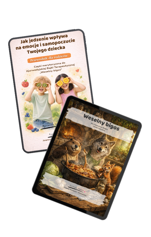 Ajurwedyjska Bajka Terapeutyczna „Weselny bigos” + Przewodnik dla rodziców – Jak jedzenie wpływa na emocje i samopoczucie Twojego dziecka