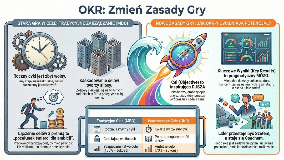 To nie jest kolejna, sucha książka o OKR-ach. To manifest i przewodnik transformacyjny dla każdego lidera, menedżera i Agile Coacha, który ma odwagę przestać być „nadzorcą”, a stać się prawdziwym architektem sukcesu.
