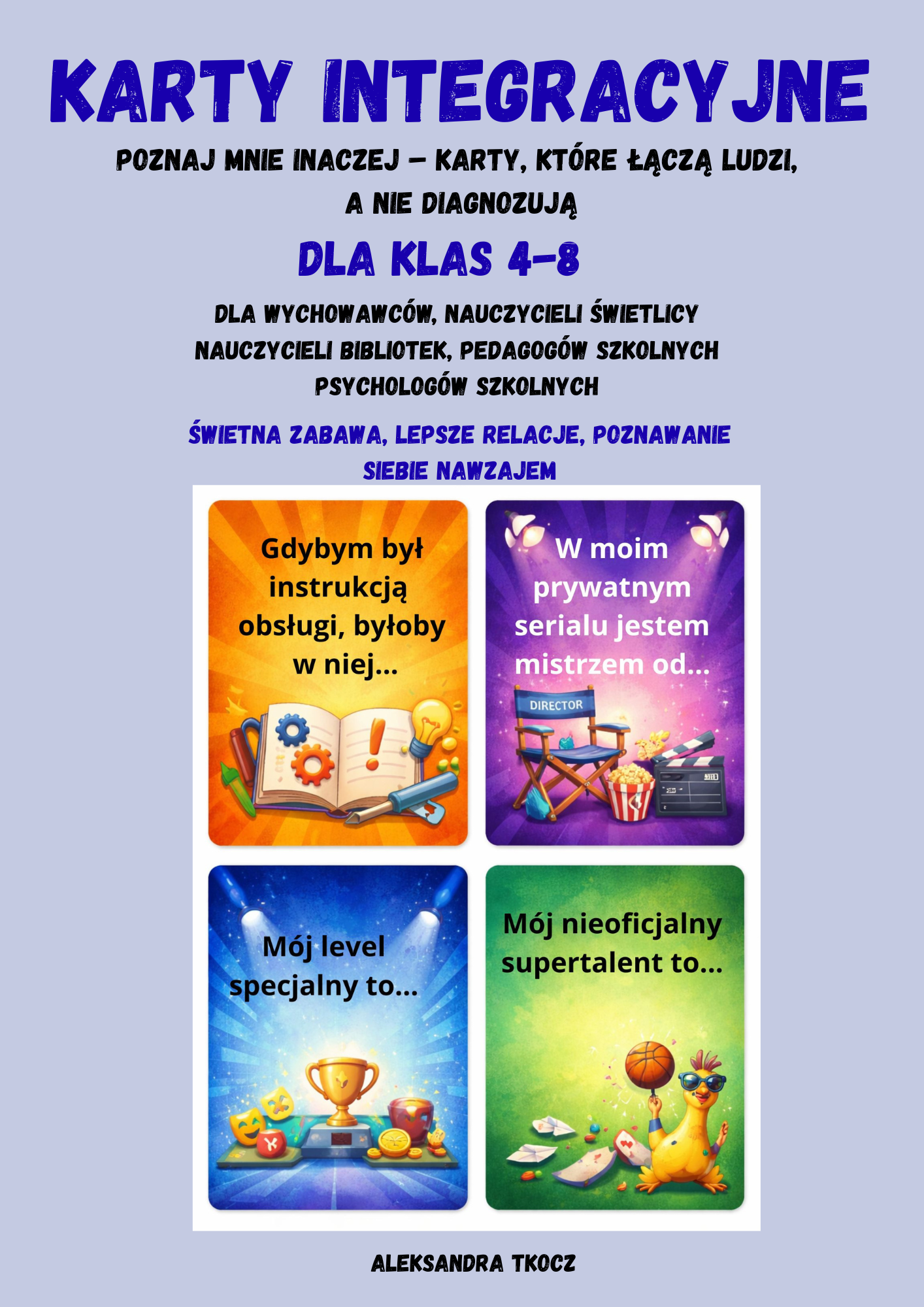 Karty integracyjne "Poznaj mnie inaczej" - dla klas 4-8Karty integrujące zespół klasowy lub grupę. Bez diagnozowania, bez oceniania, bez spiny.9,00 zł -