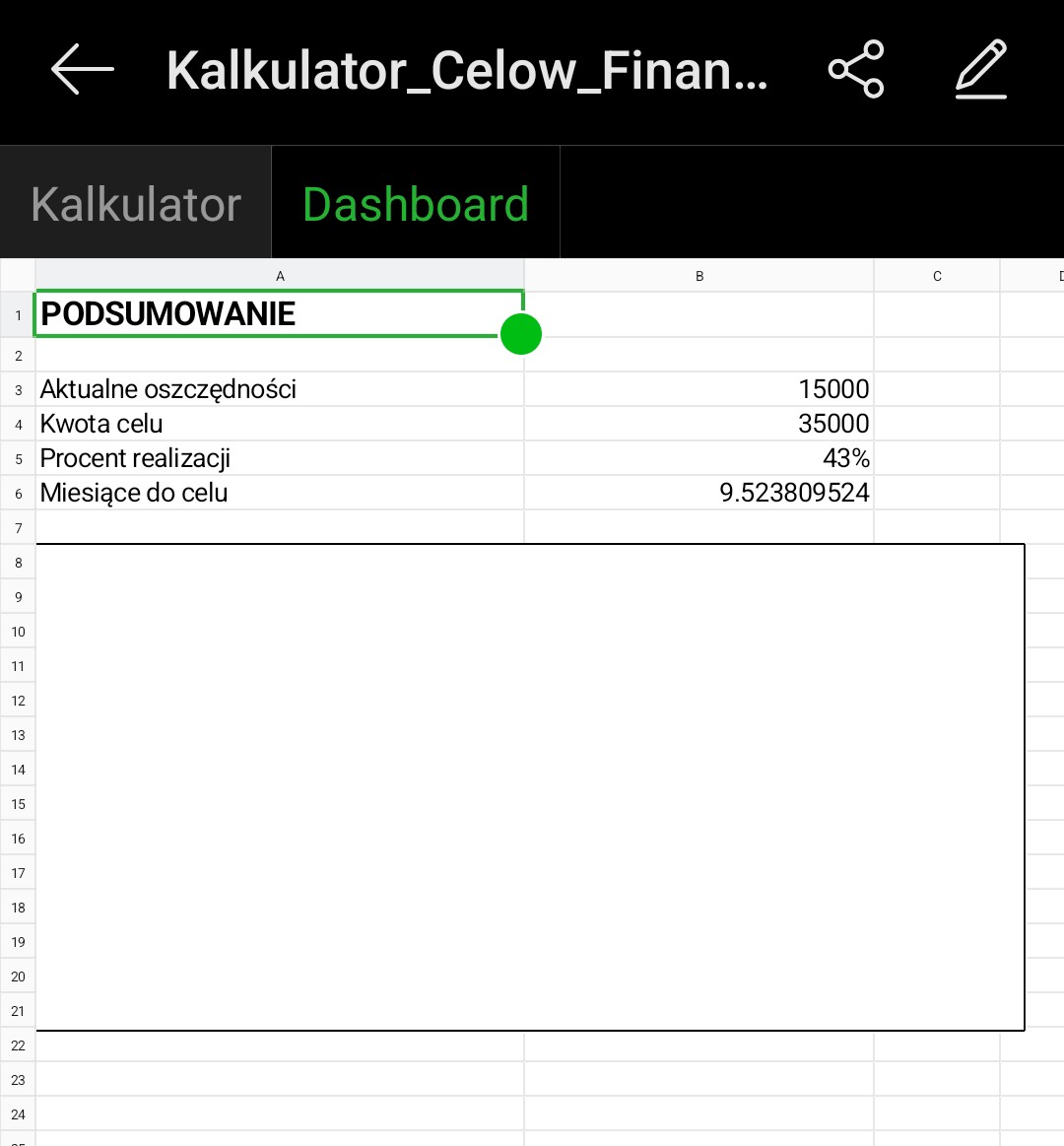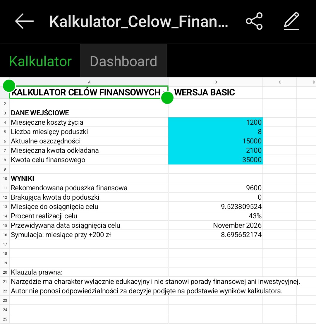 Nie musisz nic tworzyć ani liczyć ręcznie. Masz gotowe formuły, datę celu i procent realizacji.