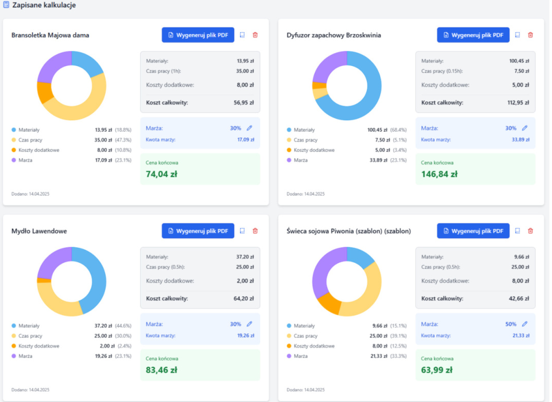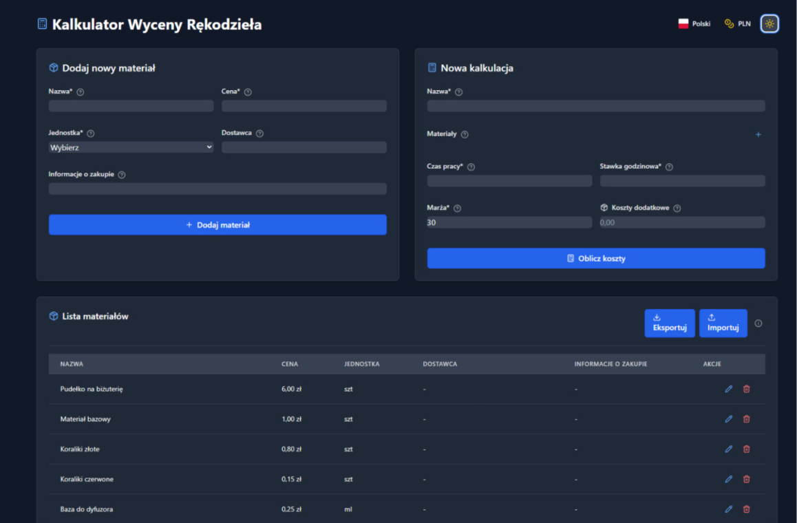 CalcuCraft to zaawansowane oprogramowanie zaprojektowana z myślą o rękodzielnikach, artystach i małych manufakturach, którzy potrzebują precyzyjnie wyceniać swoje produkty. Dzięki naszemu rozwiązaniu już nigdy nie będziesz musiał zgadywać ile naprawdę warta jest Twoja praca!
