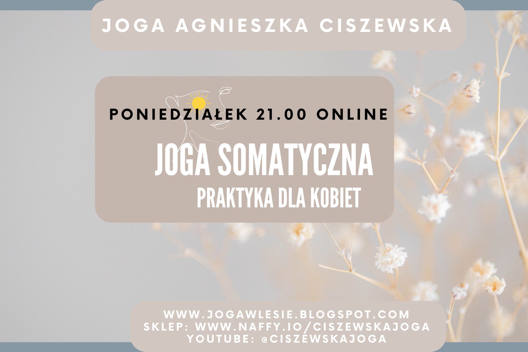 Zapraszam Cię na JOGĘ SOMATYCZNĄ – praktykę, która otuli Cię spokojem i pozwoli poczuć się cudownie wyciszoną. Kup karnet na miesiąc i dołącz do naszych poniedziałkowych spotkań online. Pozwól sobie na chwilę dla siebie – zasługujesz na to! 💫
