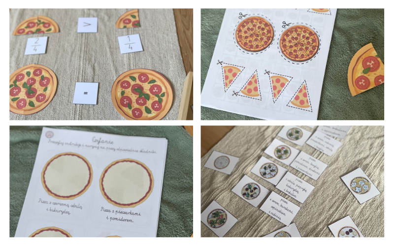 gotowa pomoc do nauki ułamków: karty z ułamkami + pizza do układania