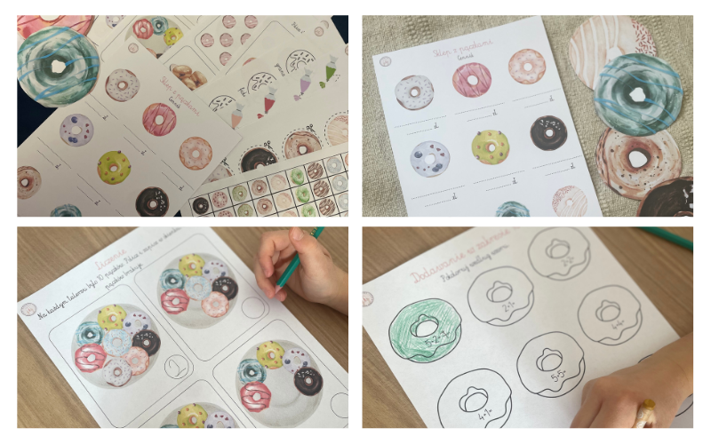 -matematyka: sklepik z pączkami, przeliczanie, działania w zakresie 20, karty klamerkowe, porównywanie ilości, dopełnianie do 10