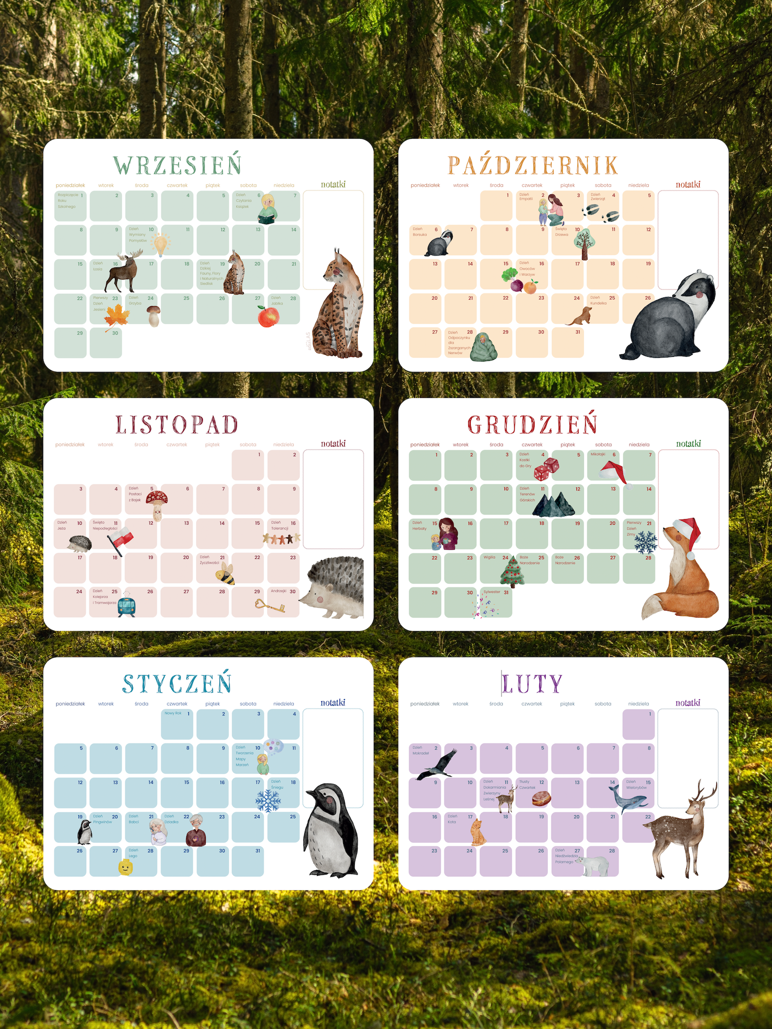 Kalendarz eduLAS to autorski, ilustrowany planer na pierwszy semestr roku szkolnego 2025/2026 (wrzesień-luty). To narzędzie do organizacji roku szkolnego i planowania tematycznych aktywności. Nietypowe święta skupione wokół natury i wartości to doskonały sposób na budowanie świadomości ekologicznej i empatii wobec świata przyrody.