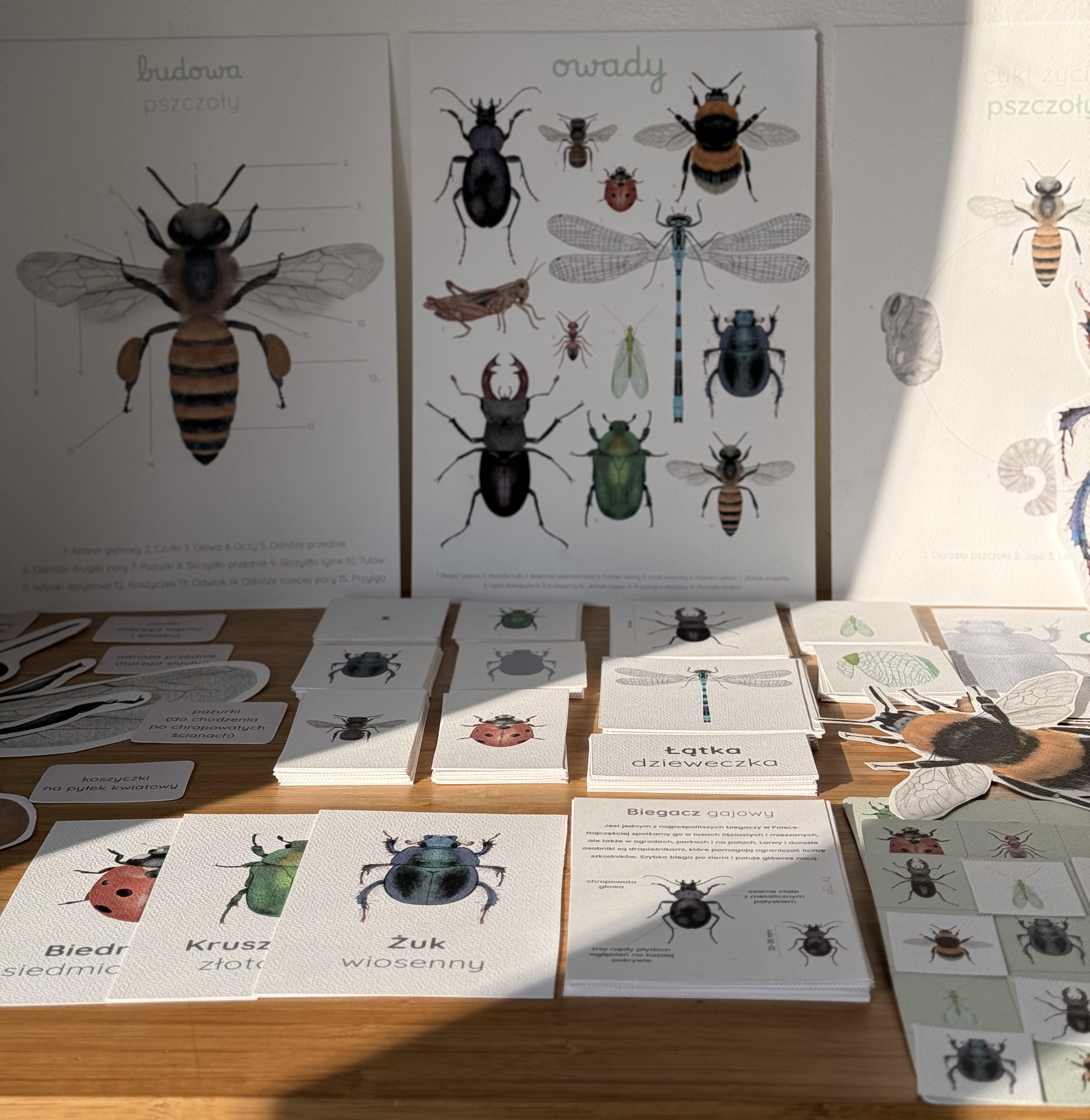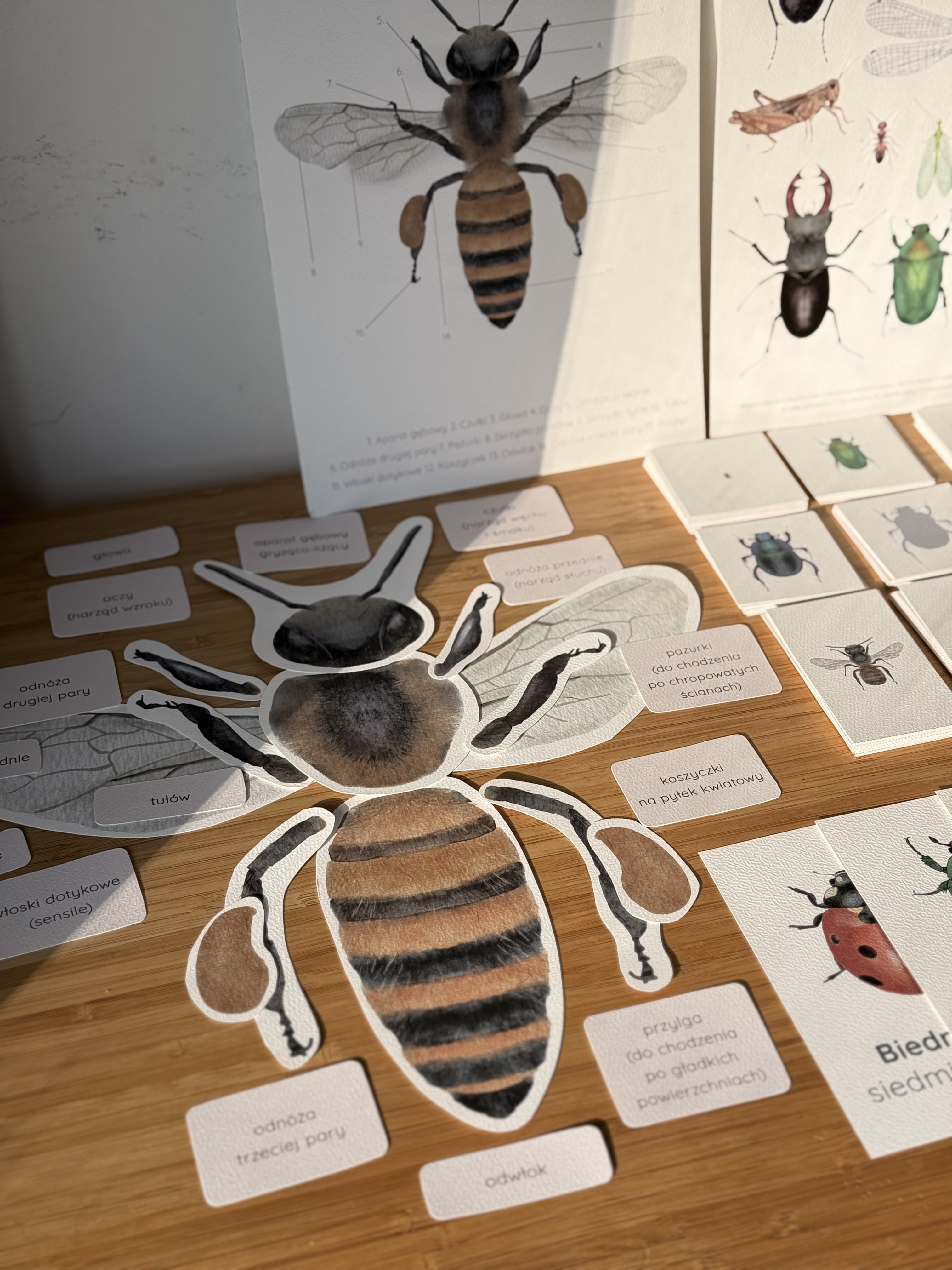 W środku znajduje się 12 kart edukacyjnych o popularnych gatunkach owadów, plansza ze wszystkimi owadami, sylwetki owadów w powiększeniu oraz dodatkowe plansze poświęcone pszczole: budowa pszczoły i cykl życia pszczoły. Zestaw zawiera również elementy budowy pszczoły do wycięcia i dopasowania, karty z etapami jej rozwoju, karty do łączenia nazw z ilustracjami, dopasowywania fragmentów ciała do sylwetki, obserwacji z użyciem lupy, łączenia kolorowych owadów z ich cieniami oraz grę memory. Dodatkowo przygotowałyśmy 3 plansze sudoku, atlas owadów do samodzielnego stworzenia i karty do projektu własnych owadów.
