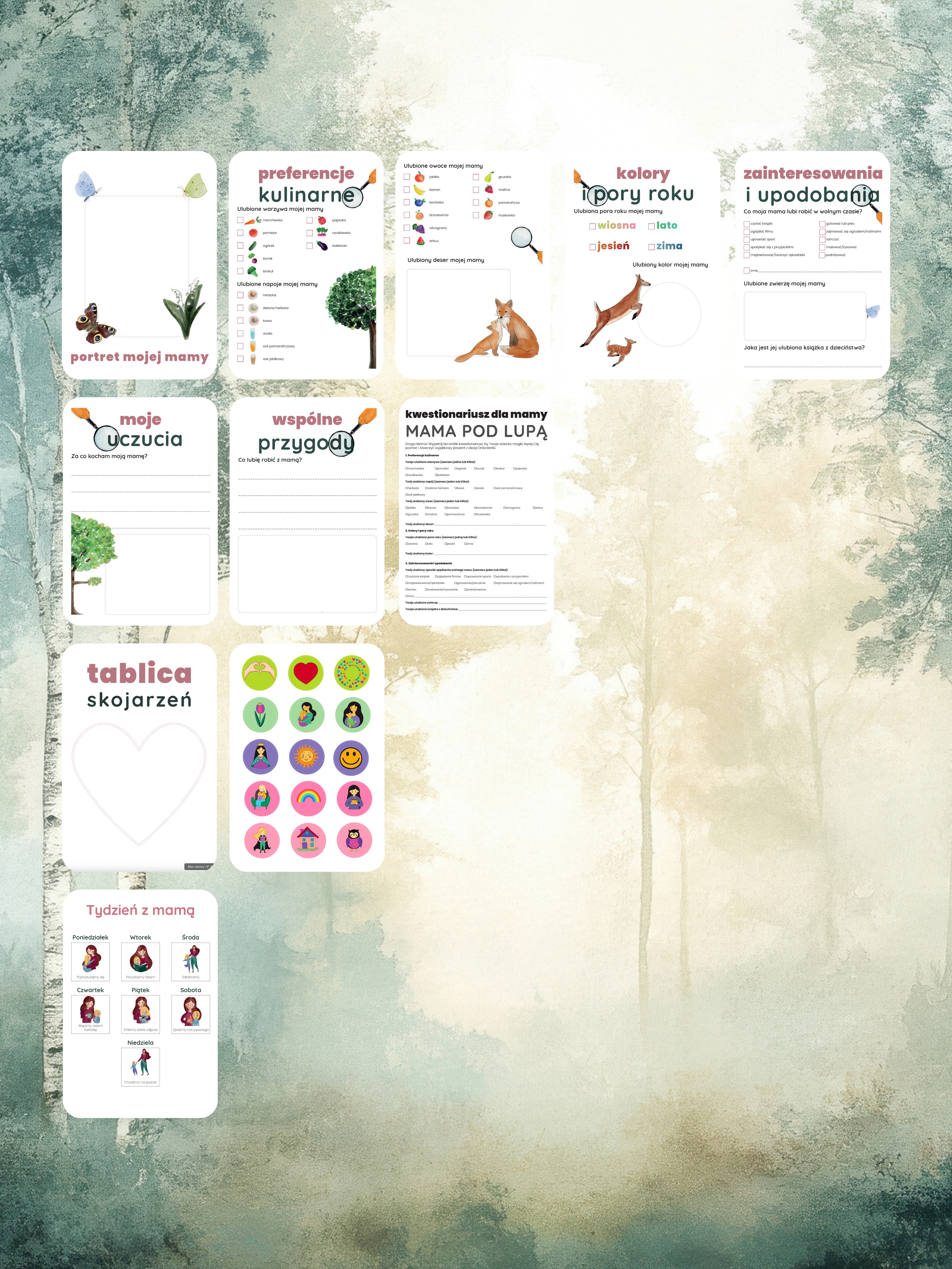 Wyjątkowe materiały do wykorzystania w Dzień Matki i nie tylko. Zestaw "Mama pod lupą" nie jest typową laurką. To prawdziwa podróż odkrywcza, podczas której dziecko poznaje mamę i zastanawia się nad własnymi uczuciami. W skład zestawu wchodzą karty do wypełnienia podzielone na sekcje tematyczne, naklejki do tablicy skojarzeń, kwestionariusz dla mamy oraz dodatek Tydzień z mamą.