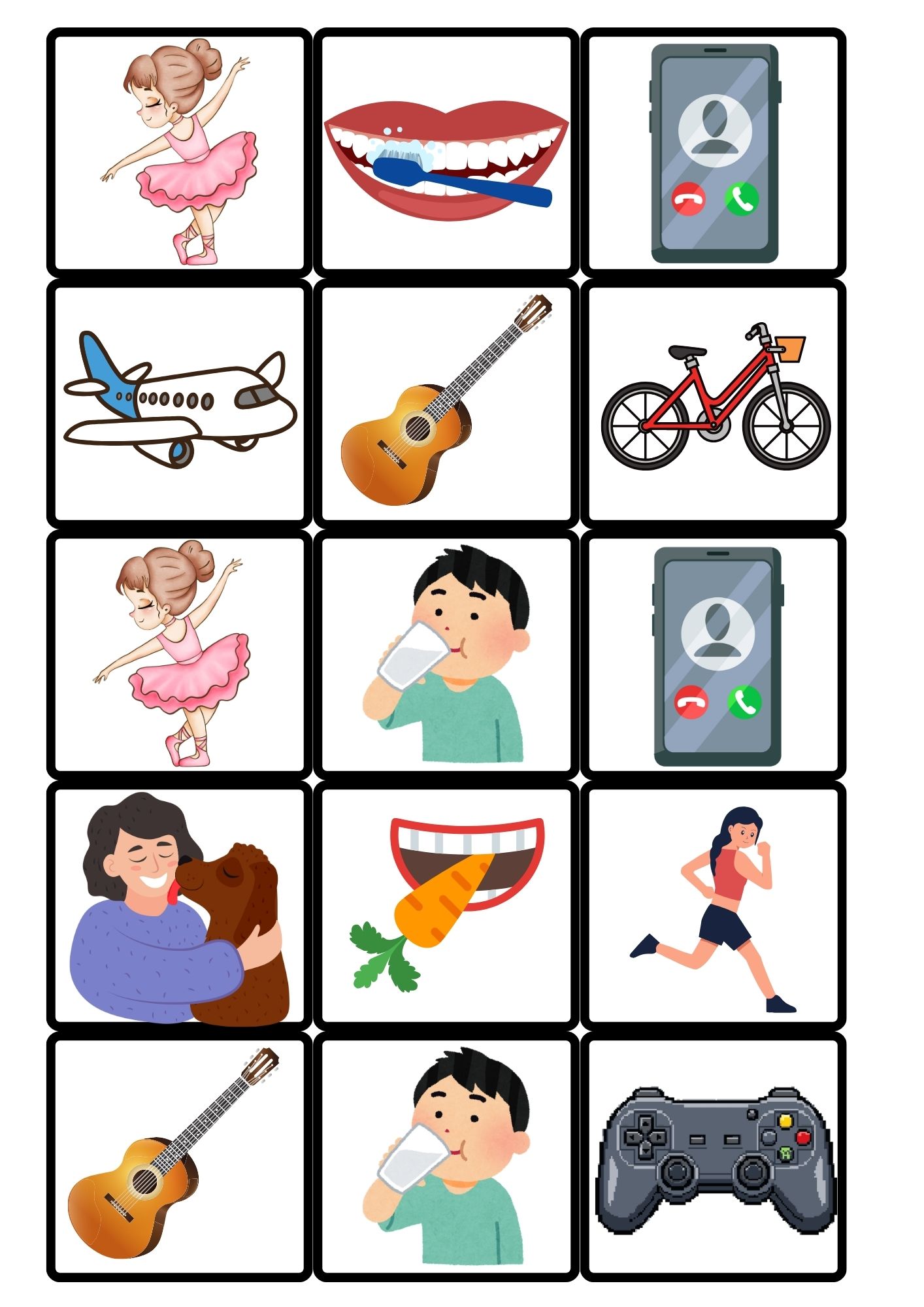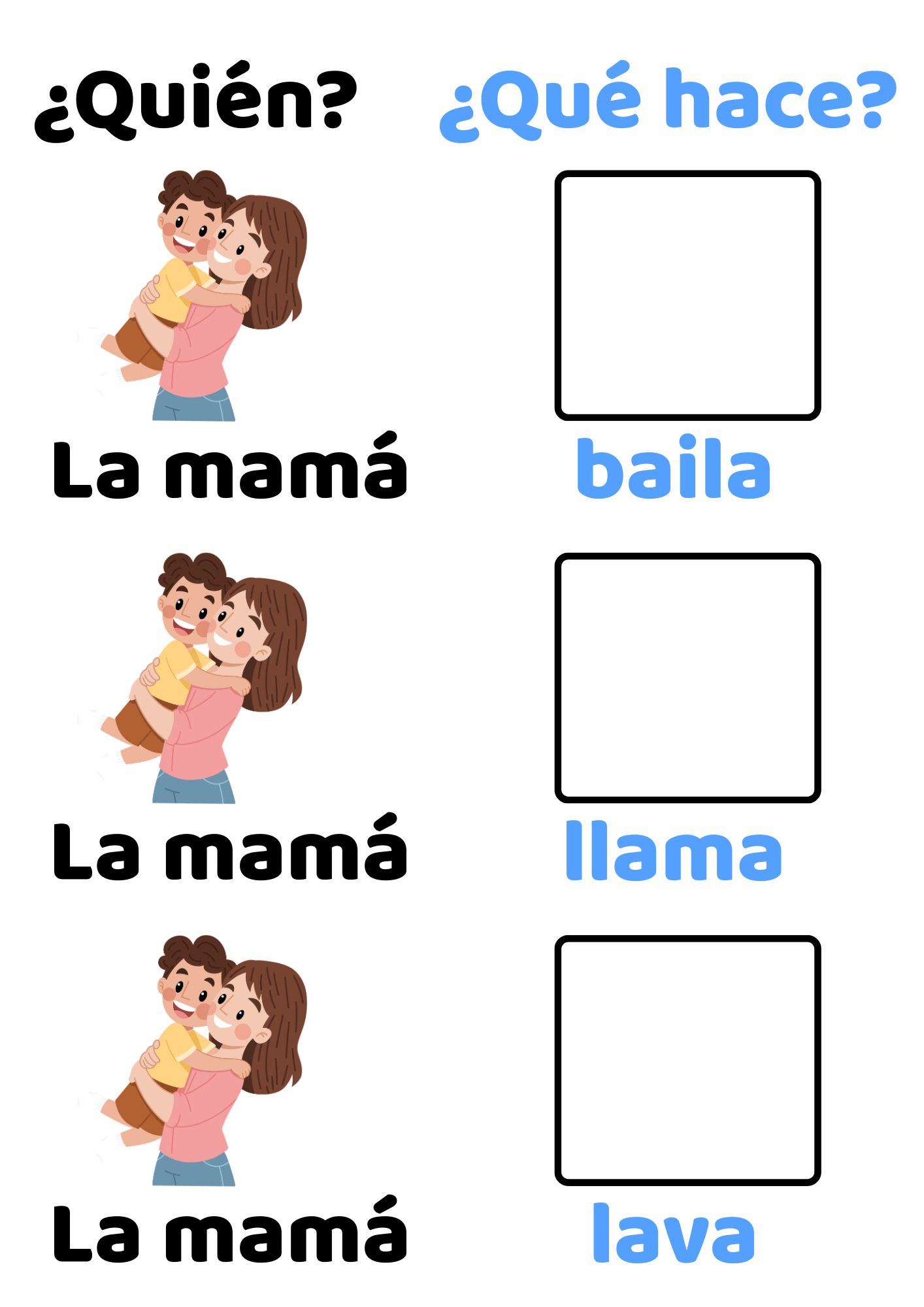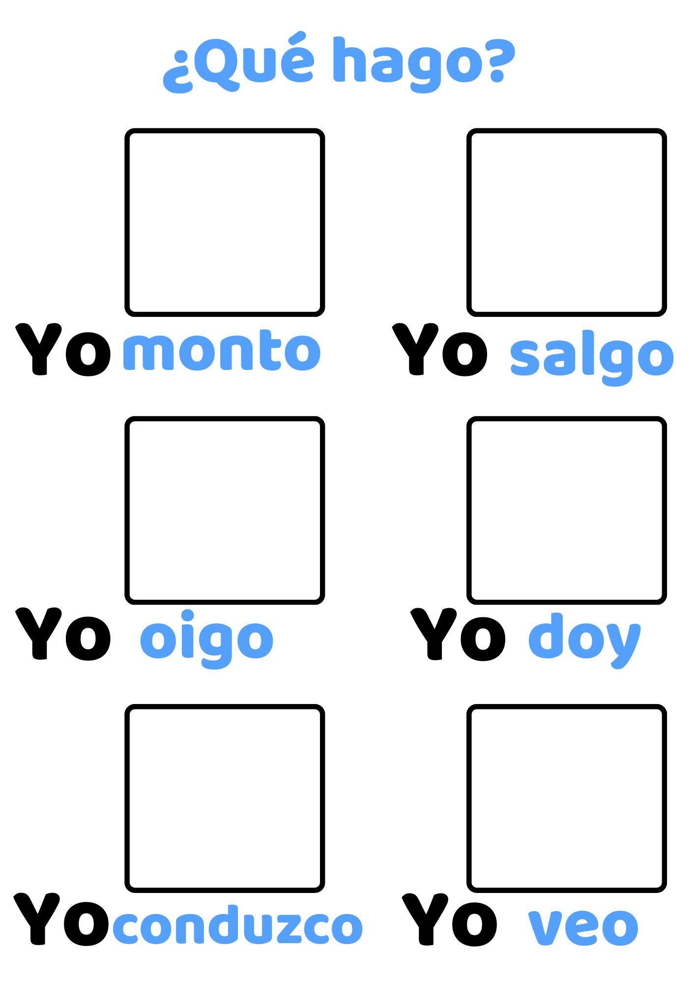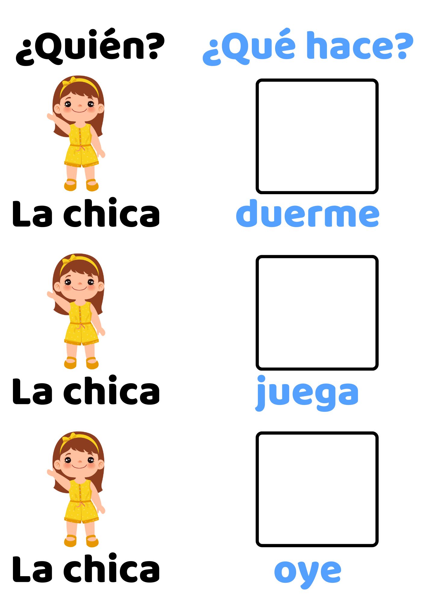 Książeczka skupia się na czasownikach i tworzeniu prostych zdań w języku hiszpańskim. Dziecko dopasowuje obrazki do podpisów i w ten sposób aktywnie ćwiczy rozumienie znaczenia czasowników.