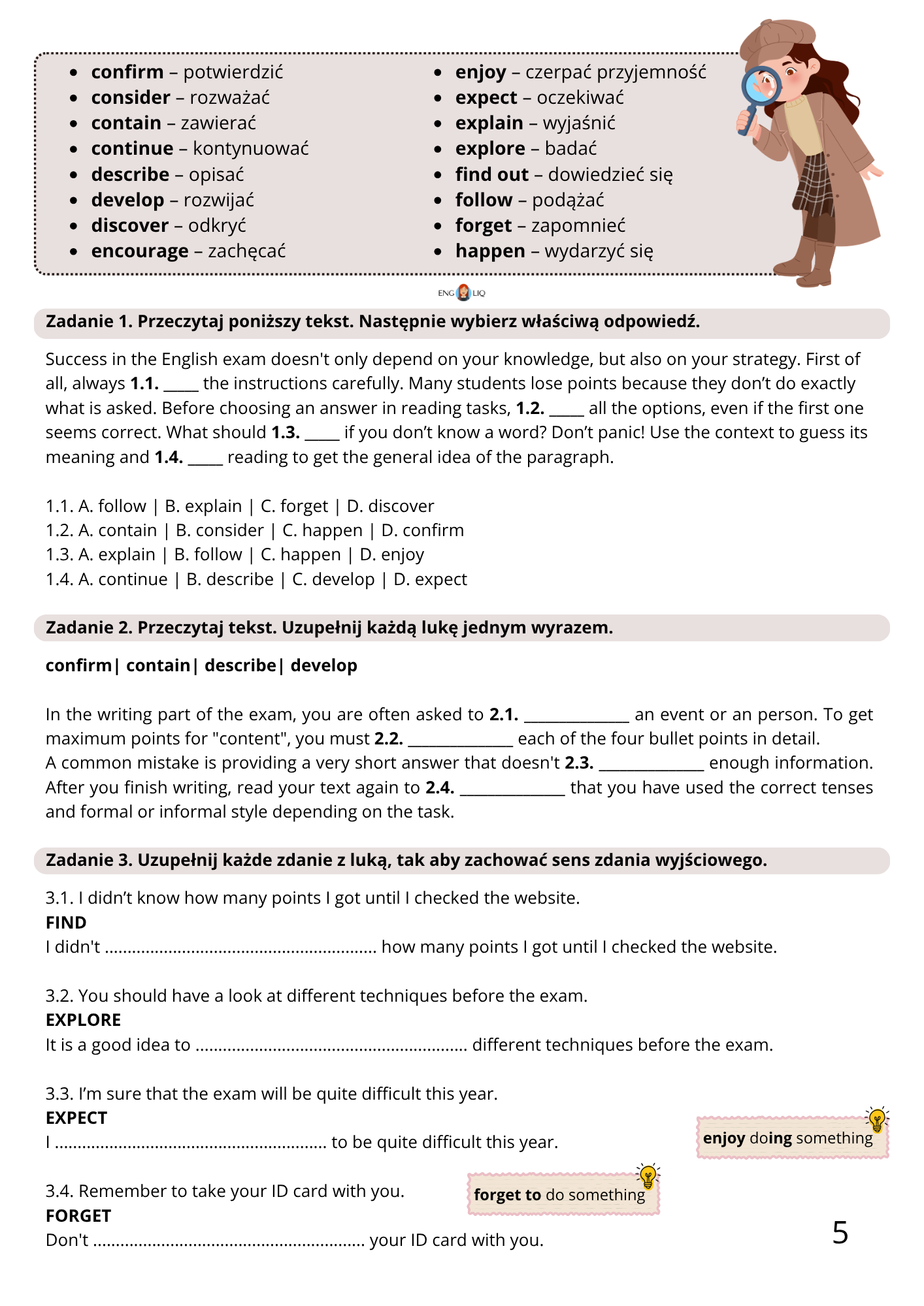 Tematyka zadań skupia się na strategiach egzaminacyjnych, co pozwoli przećwiczyć wymagane słownictwo oraz utrwalić zasady pracy z arkuszem.