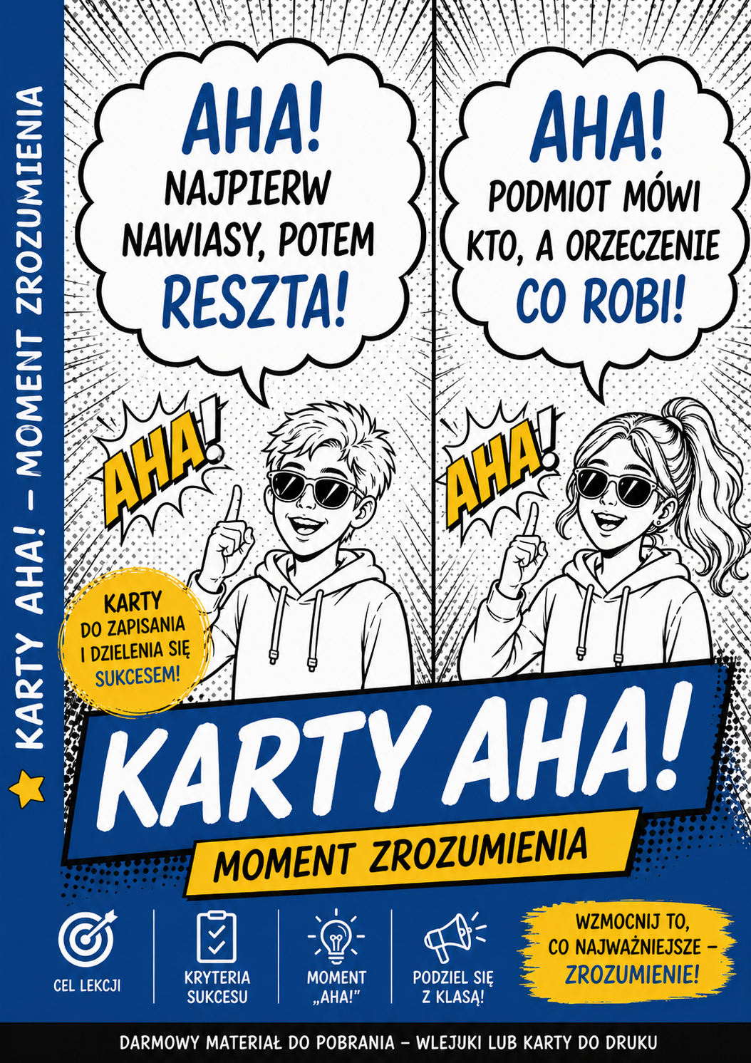 DarmowyAHA! – złap moment zrozumieniaKarty AHA! pomagają uczniom zauważać moment zrozumienia i wzmacniać poczucie sukcesu w nauce. -