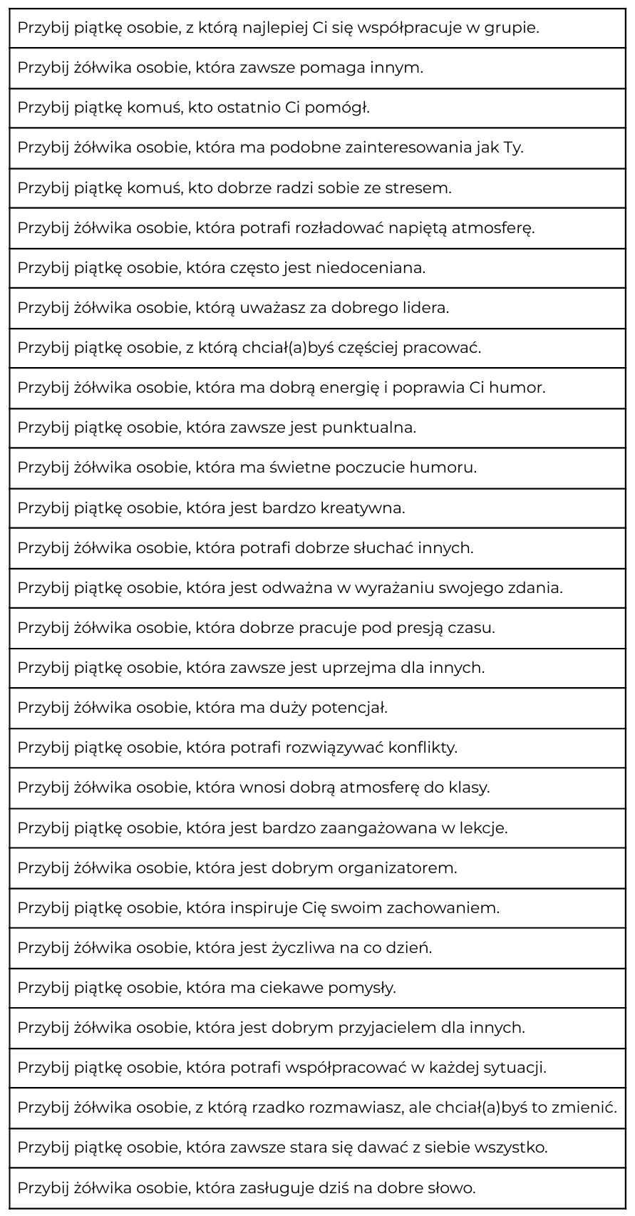 DarmowyFeedback w klasie – przybij piątkęZestaw 30 kart i instrukcja do integracji klasy i udzielania pozytywnego feedbacku. -