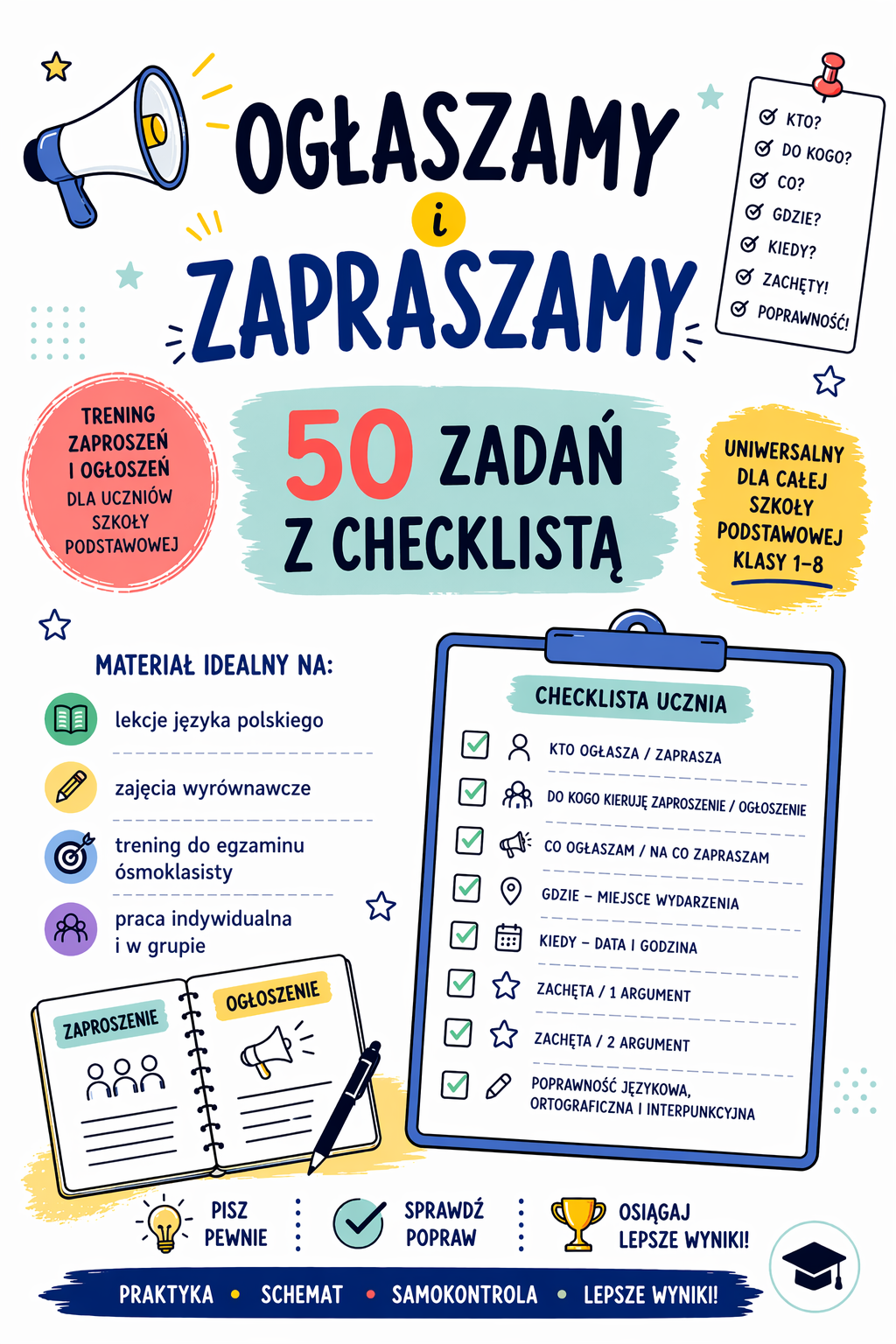 38% rabatuOgłaszamy i zapraszamy – 50 zadań treningu zaproszeń i ogłoszeń.50 kart pracy do nauki pisania zaproszeń i ogłoszeń z chcecklistą kontrolną. Piszę i sprawdzam!25,00 zł15,50 zł -
