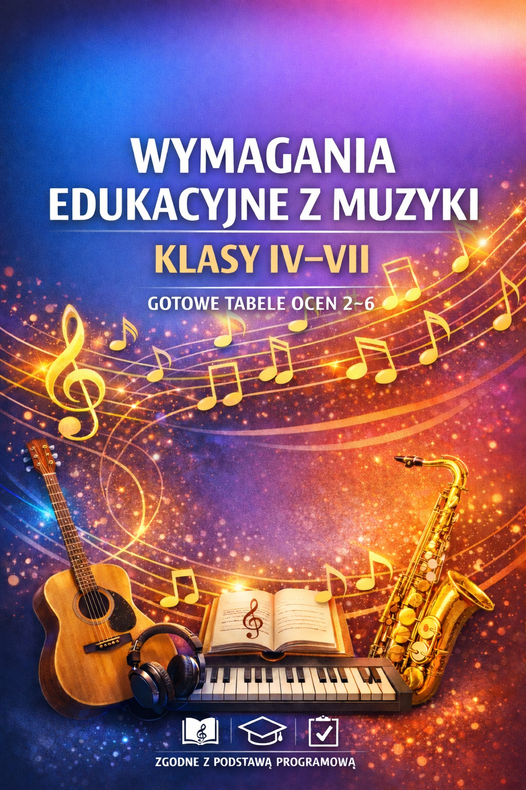 Gotowe wymagania edukacyjne z muzyki dla klas IV-VII, 2025/26Wymagania z muzyki IV–VII zgodne z podstawą, w tabelach, skala 2–6, jasne i gotowe do użycia.25,00 zł -