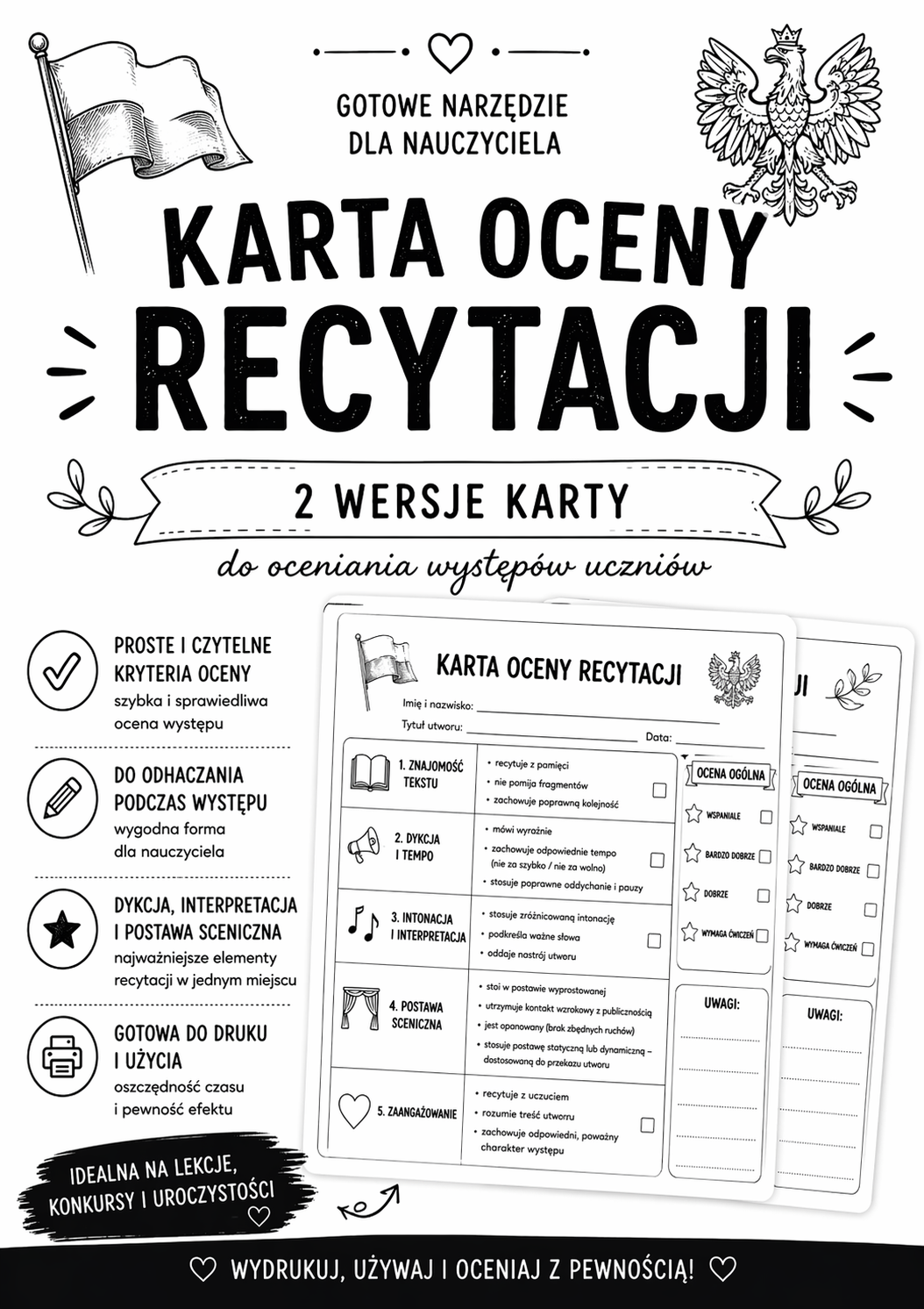 DarmowyKarty oceny recytacji - 2 wersjeProste kryteria, czytelna forma do odhaczania i nacisk na kluczowe elementy recytacji wiersza.
