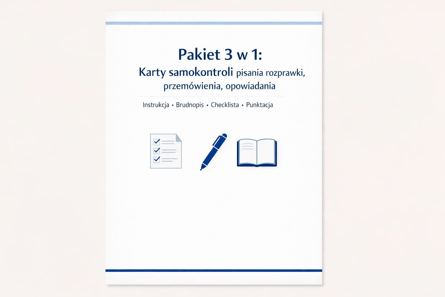 Pakiet 3 w 1: Karty samokontroli pisania rozprawki, przemówienia, opowiadaniaPakiet kart samokontroli: rozprawka, przemówienie i opowiadanie – pomoc w pisaniu wypracowań.46,99 zł -