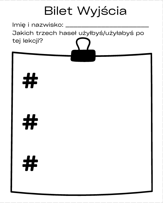 DarmowyBilet WyjściaDarmowy bilet wyjścia: 3 hasztagi (#), którymi uczniowie podsumowują lekcję. -