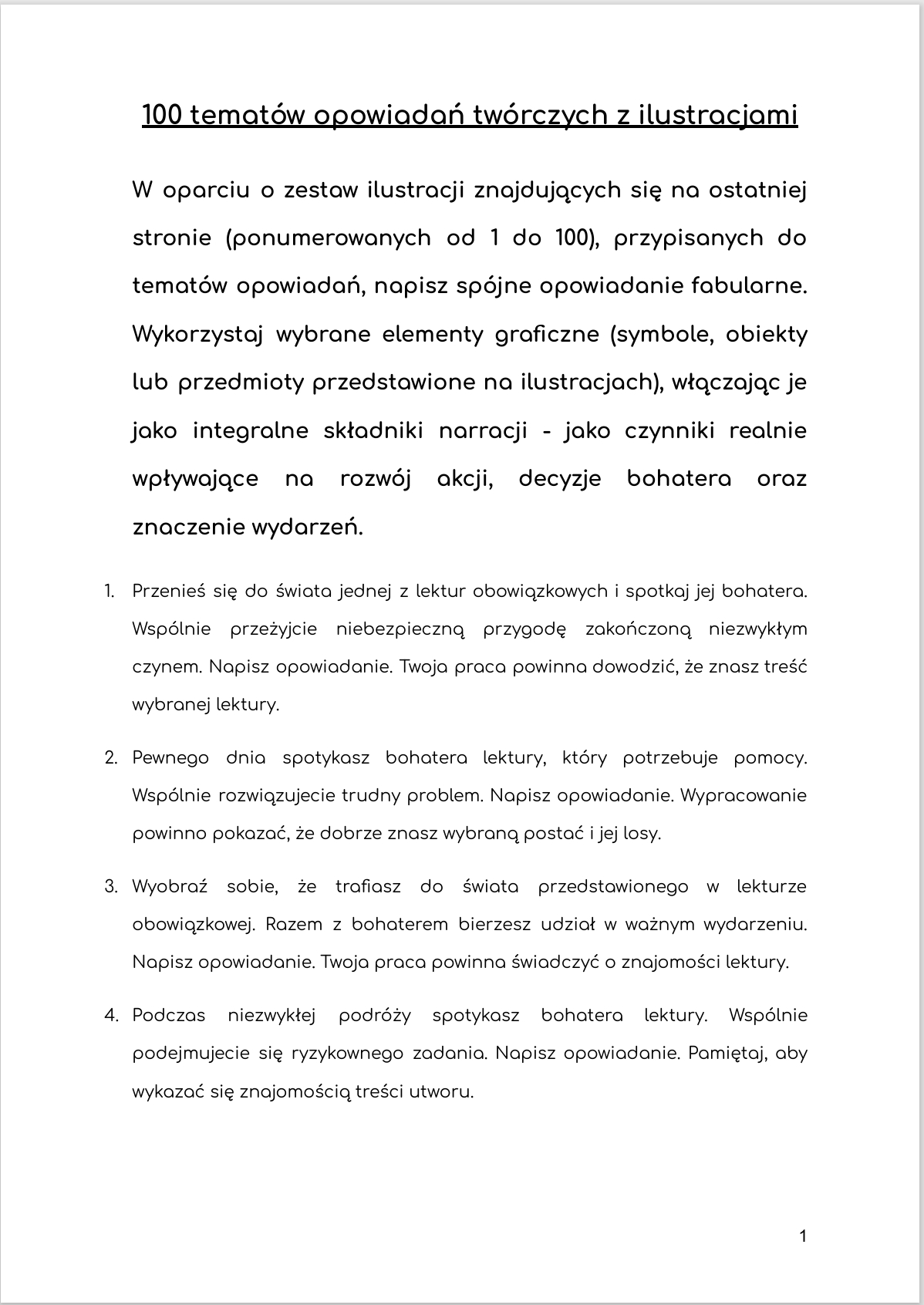 100 tematów opowiadań egzaminacyjnych z ilustracjami – trening pisania