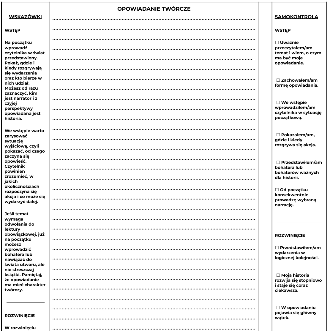 Praktyczna karta pracy dla uczniów szkoły podstawowej, która pomaga zaplanować, napisać i sprawdzić opowiadanie twórcze zgodnie z wymaganiami egzaminacyjnymi.