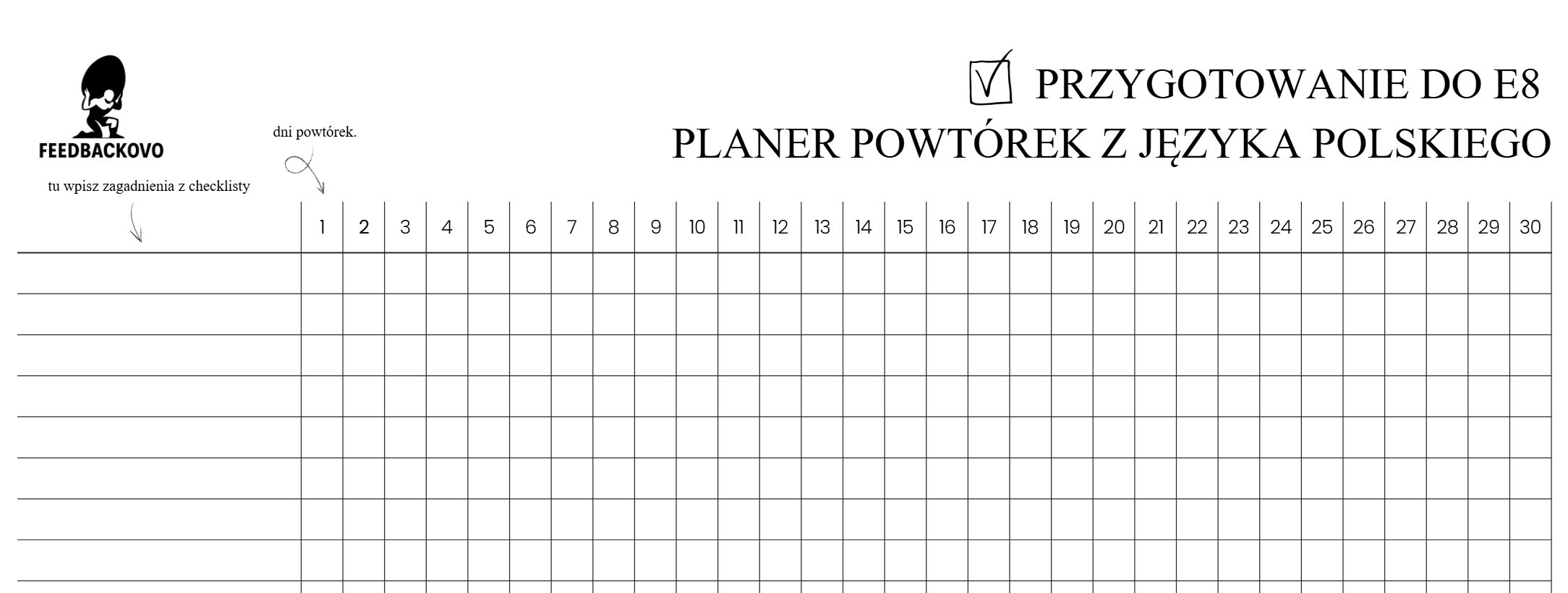Planer powtórek - tracker - prowadzi ucznia krok po kroku – rozkłada materiał na konkretne dni, wspiera systematyczne powtórki i pozwala systematycznie odhaczać wykonane zadania. W efekcie: