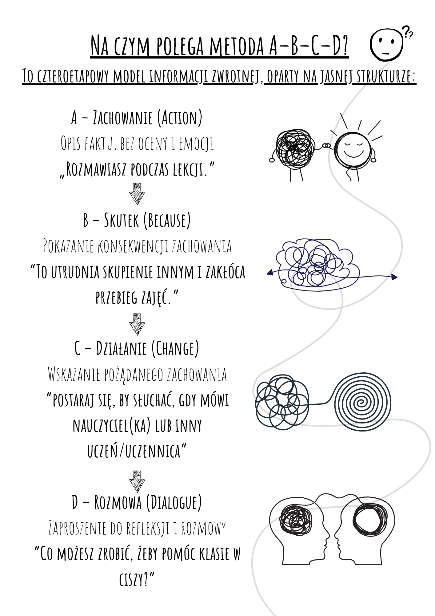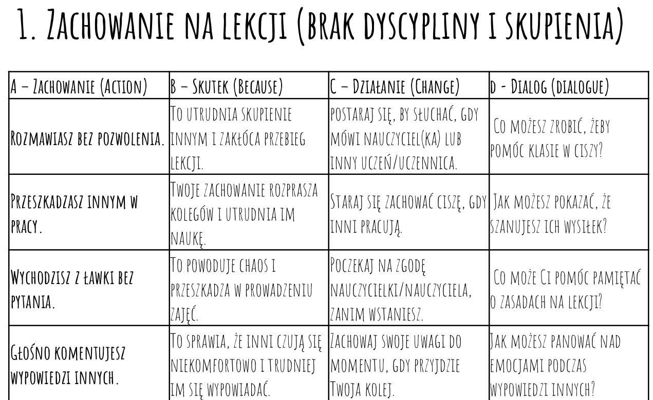 Każde zachowanie zostało rozpisane w czterech krokach A–B–C–D i zakończone pytaniem refleksyjnym, które uczy ucznia myśleć i brać odpowiedzialność.