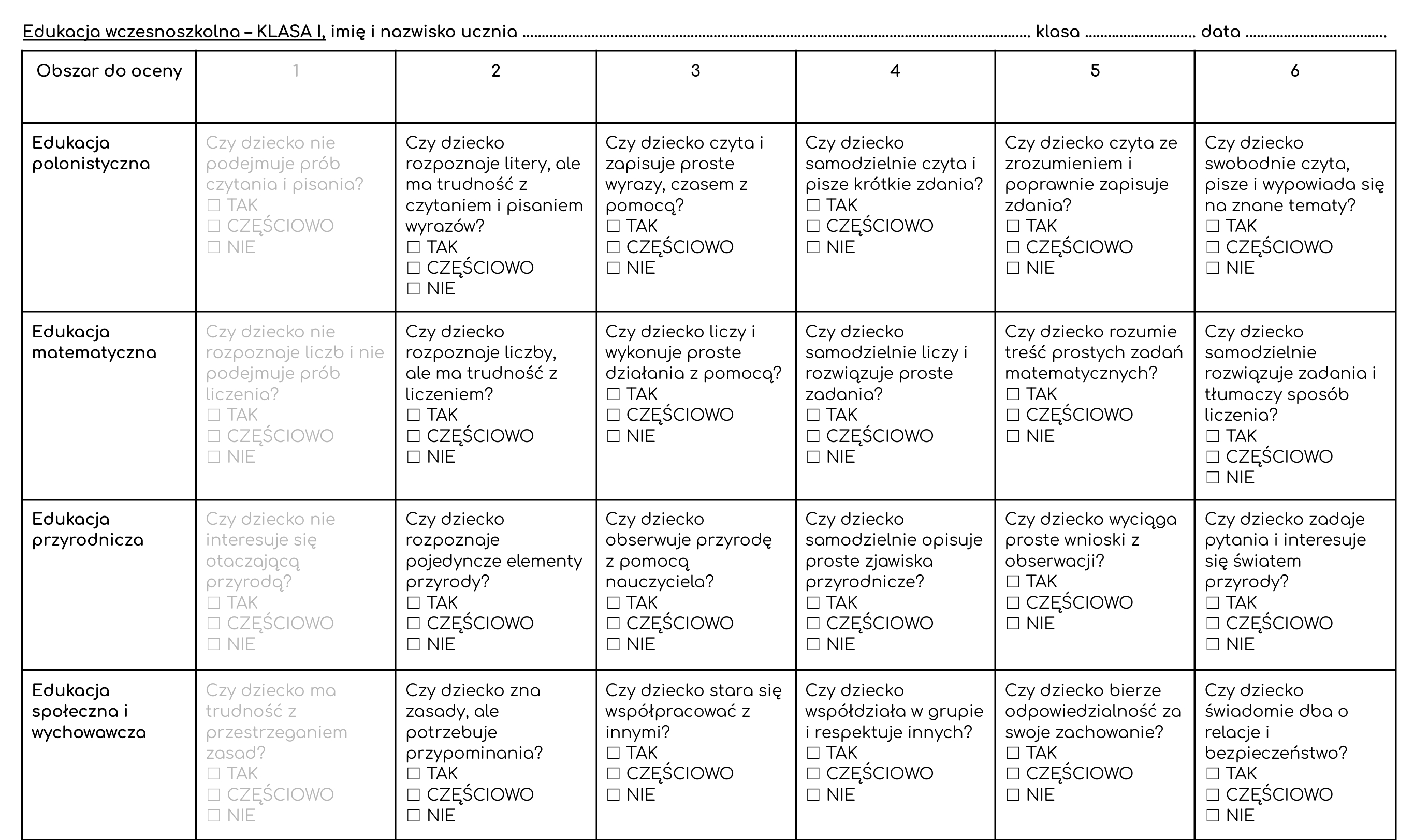 Tabela stanowi propozycję narzędzia wspierającego ocenianie i nie jest jedynym ani obowiązującym wzorem oceny. Pytania zostały sformułowane w sposób prosty i zrozumiały dla ucznia, dlatego nie są rozbudowane. Dokument jest w pełni edytowalny i może być swobodnie dostosowany do realizowanego programu nauczania, grupy oraz potrzeb nauczyciela.