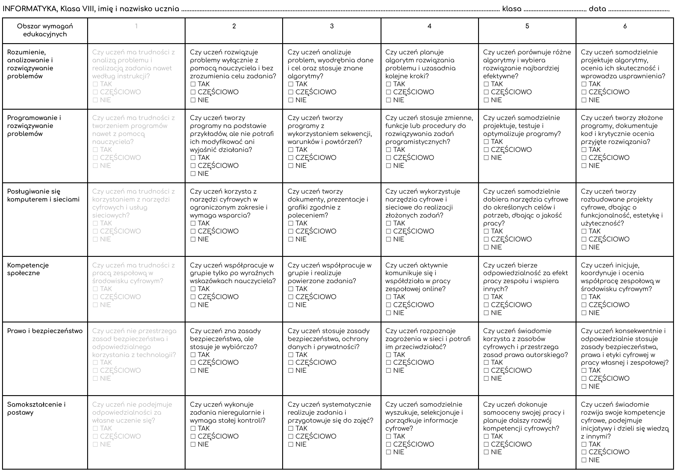 Tabela stanowi propozycję narzędzia wspierającego ocenianie i nie jest jedynym ani obowiązującym wzorem oceny. Pytania zostały sformułowane w sposób prosty i zrozumiały dla ucznia, dlatego nie są rozbudowane. Dokument jest w pełni edytowalny i może być swobodnie dostosowany do realizowanego programu nauczania, grupy oraz potrzeb nauczyciela.