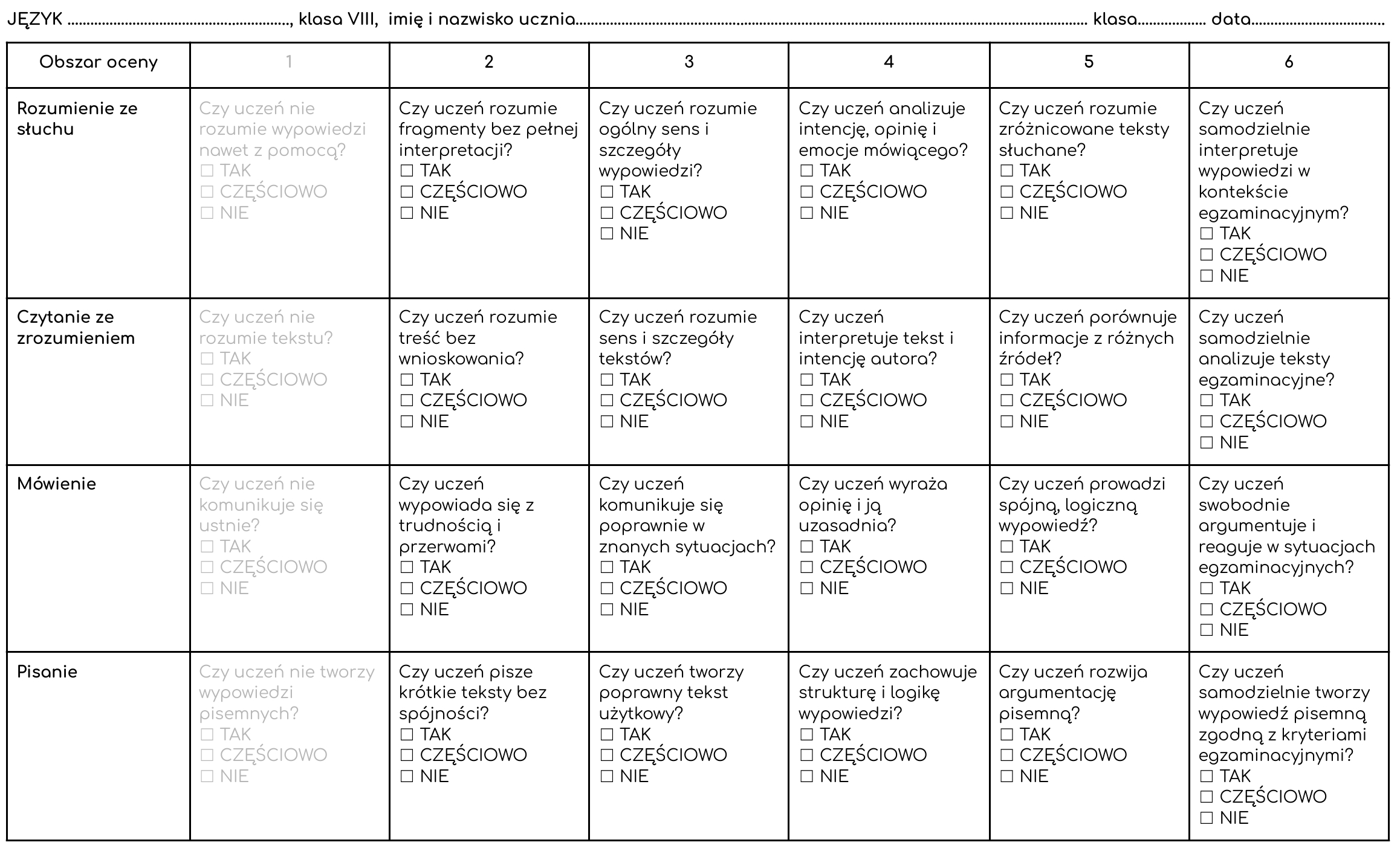 w jakim stopniu uczeń spełnia wymagania edukacyjne w zakresie kompetencji językowych – nie tylko poprzez pojedyncze sprawdziany, lecz poprzez całościową ocenę procesu uczenia się języka.