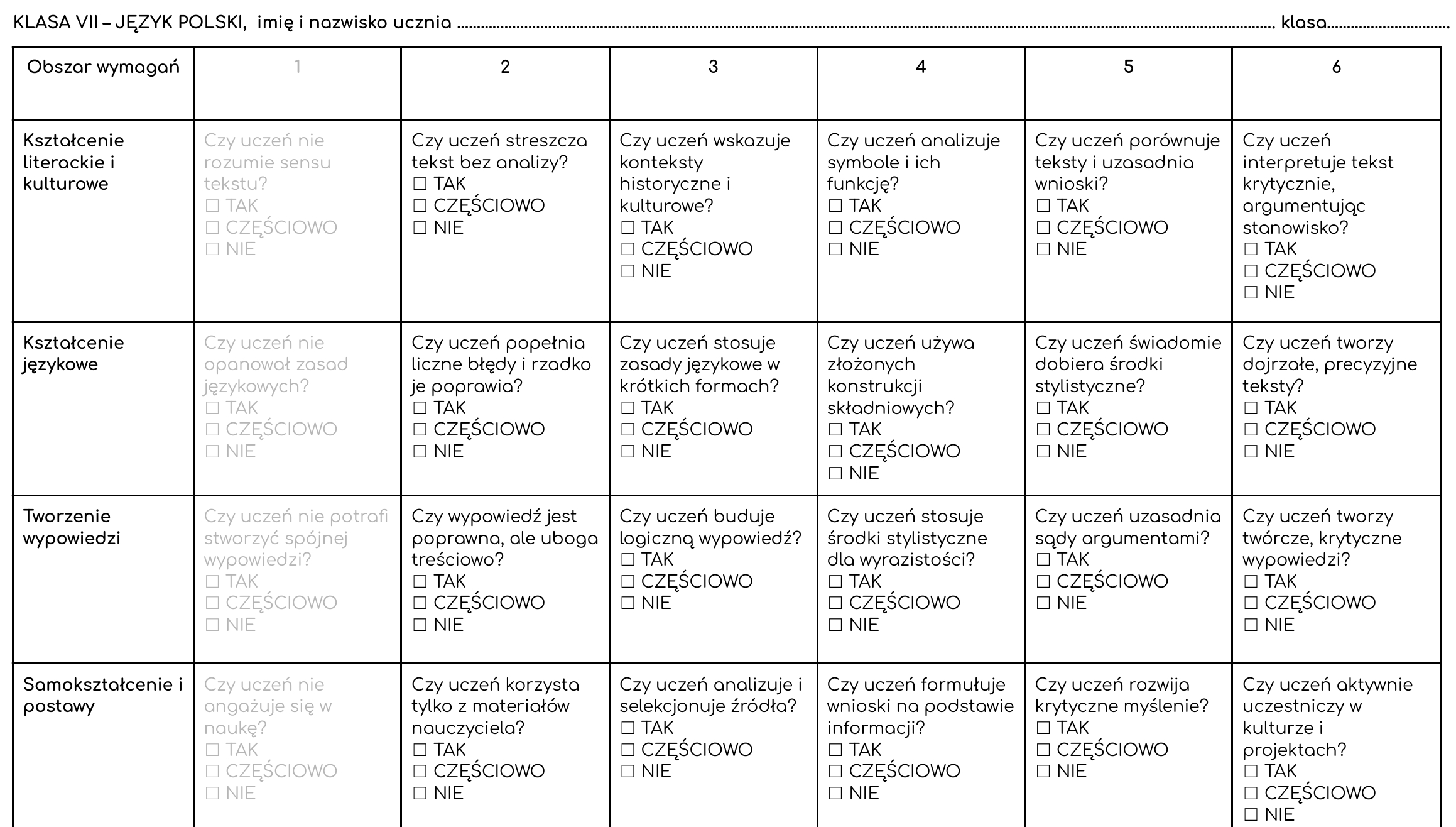 Narzędzie jest spójne z wymaganiami z języka polskiego dla klas IV–VIII, oparte na aktualnej podstawie programowej i taksonomii Blooma. Obejmuje wszystkie obszary kształcenia, w tym samokształcenie i postawy, które często decydują o ocenie w sytuacjach granicznych.