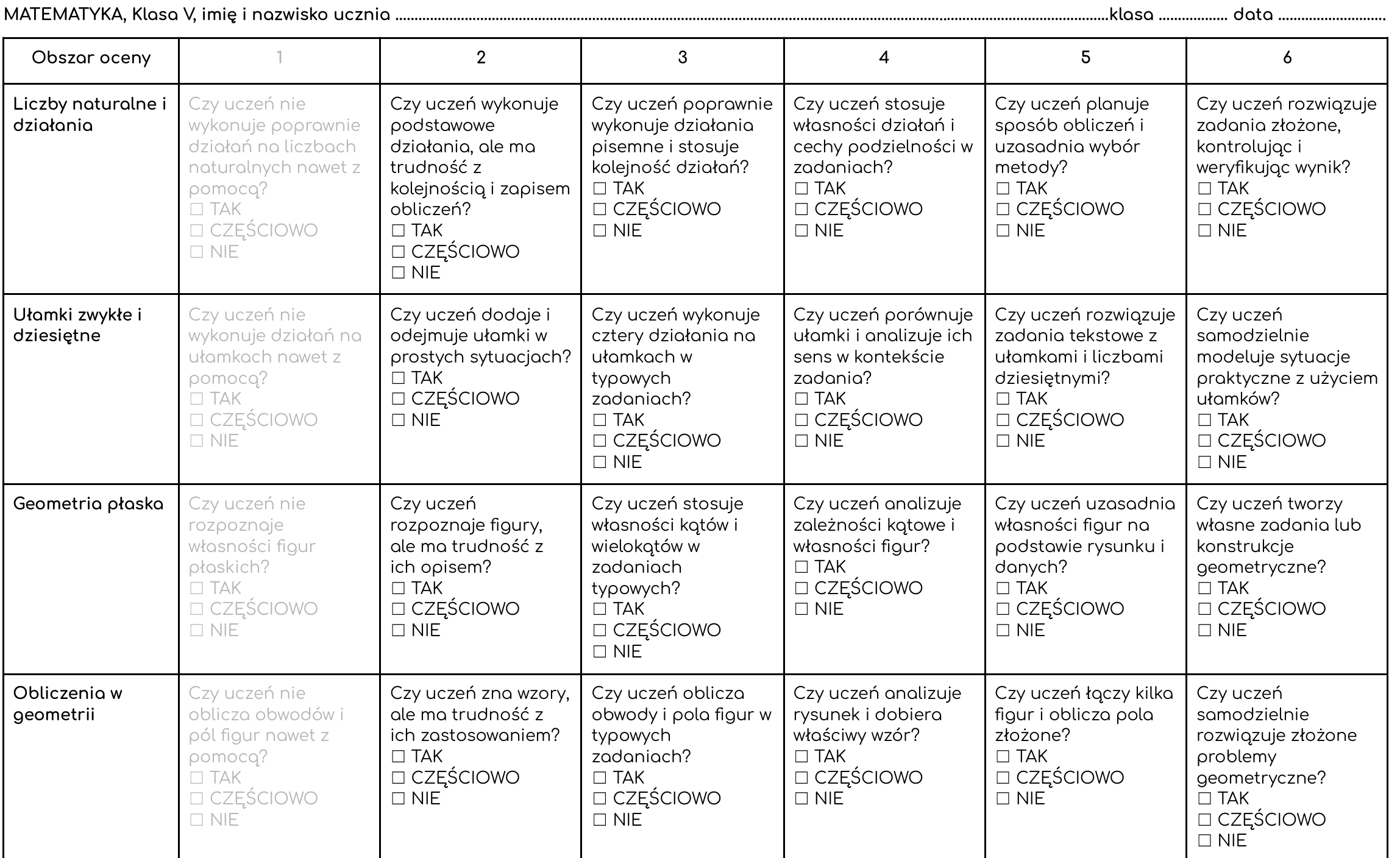 w jakim stopniu uczeń spełnia wymagania edukacyjne z matematyki – nie tylko poprzez wynik końcowy, ale poprzez analizę sposobu rozumowania, doboru strategii i samodzielności ucznia.