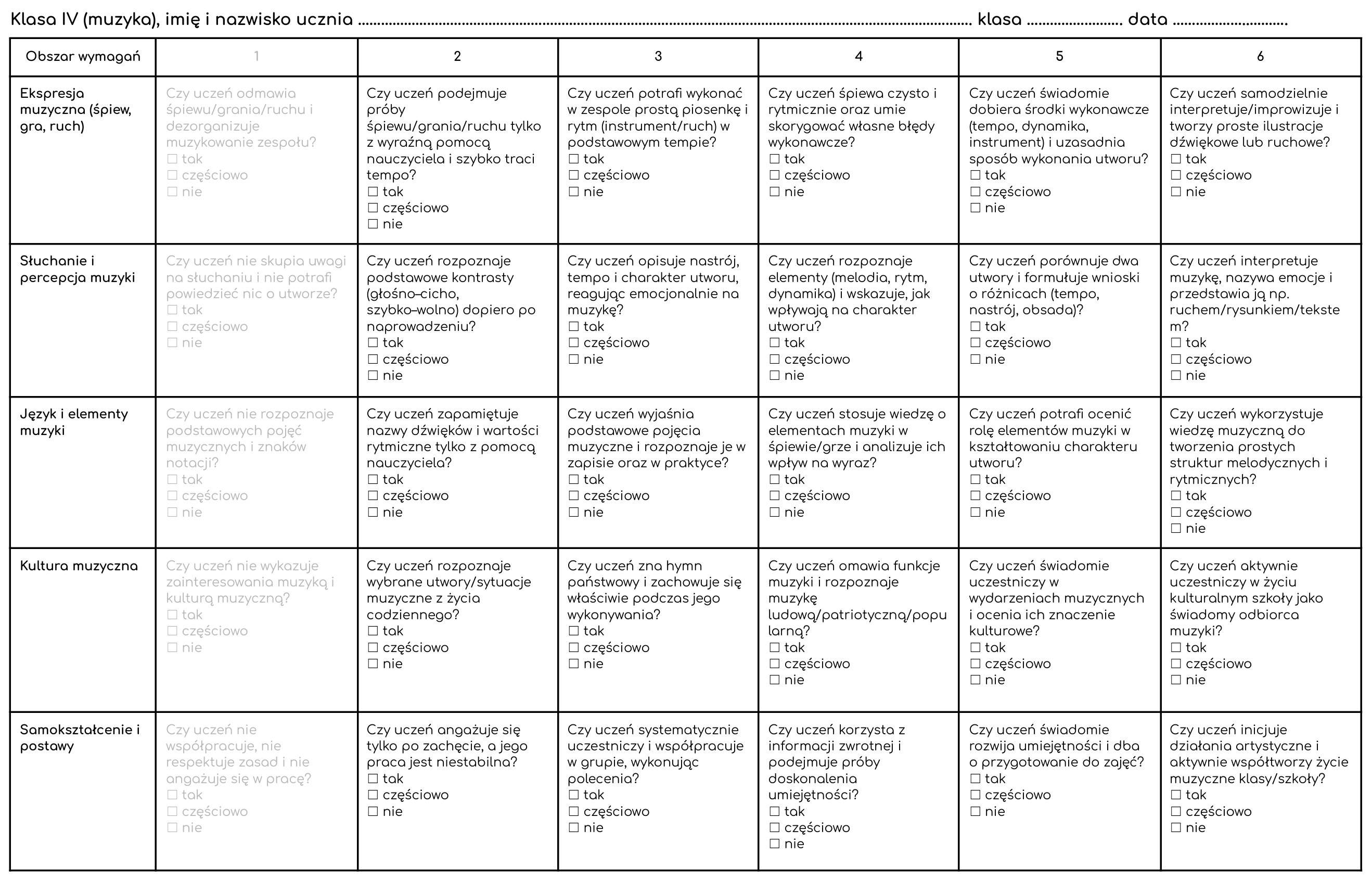 Muzyka jest przedmiotem szczególnym – ocenianiu podlega nie tylko wiedza, ale przede wszystkim działanie ucznia: śpiew, gra, ruch, słuchanie, interpretacja oraz postawa wobec wspólnego muzykowania. Narzędzie pomaga nauczycielowi odpowiedzieć na kluczowe pytanie: w jakim stopniu uczeń spełnia wymagania edukacyjne z muzyki, uwzględniając zarówno umiejętności, jak i zaangażowanie.