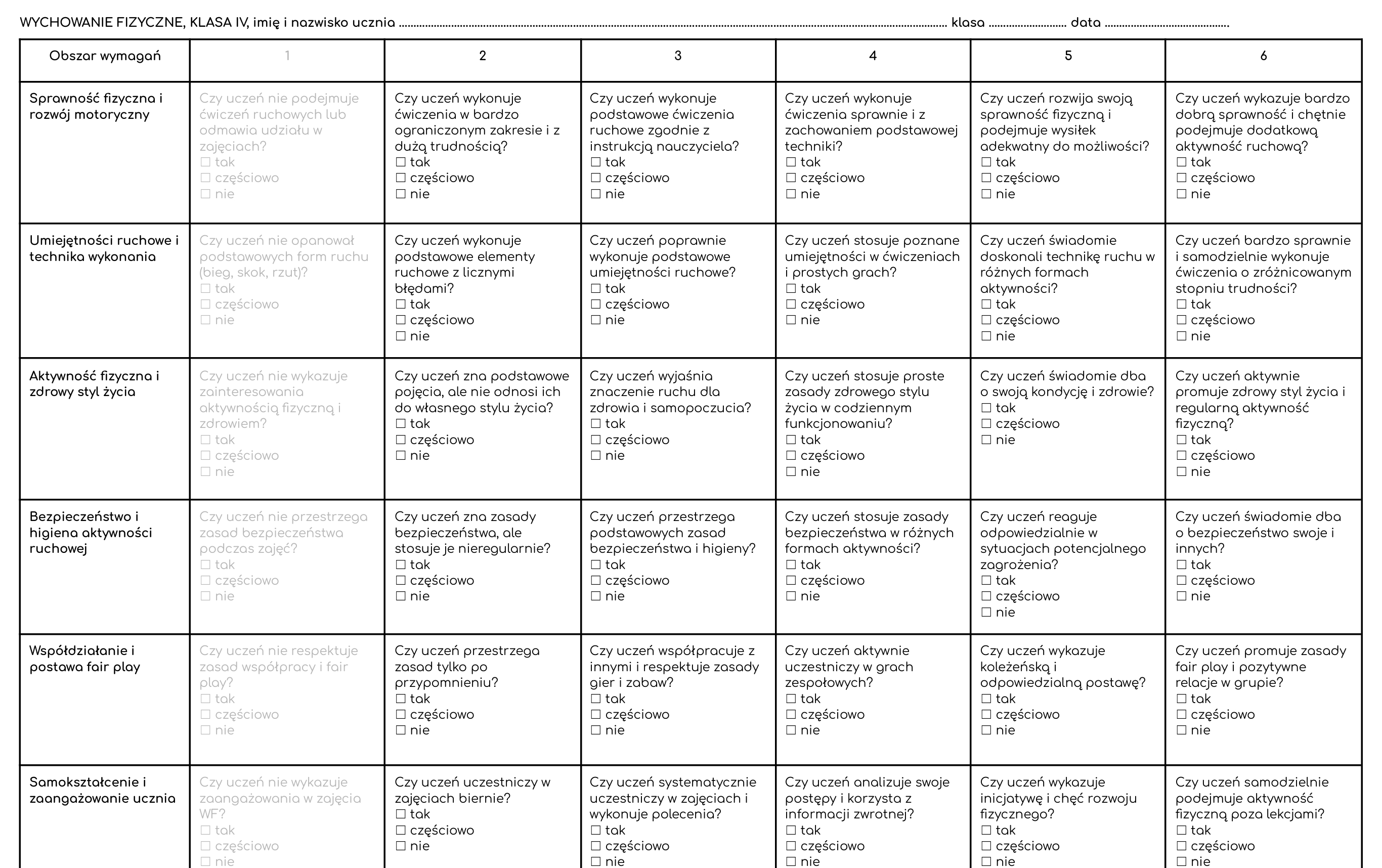 w jakim stopniu uczeń spełnia wymagania edukacyjne z wychowania fizycznego – nie przez pryzmat wyników sportowych, lecz poprzez całościową ocenę sprawności, umiejętności, postaw i zaangażowania.