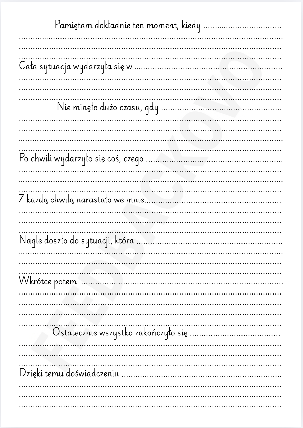 Kompleksowy zestaw 9 kart pracy (3 × 3) wspierających naukę pisania trzech kluczowych form egzaminacyjnych: rozprawki, przemówienia i opowiadania twórczego. Materiał prowadzi ucznia przez cały proces tworzenia wypowiedzi – od rozpoczęcia aż po zakończenie.