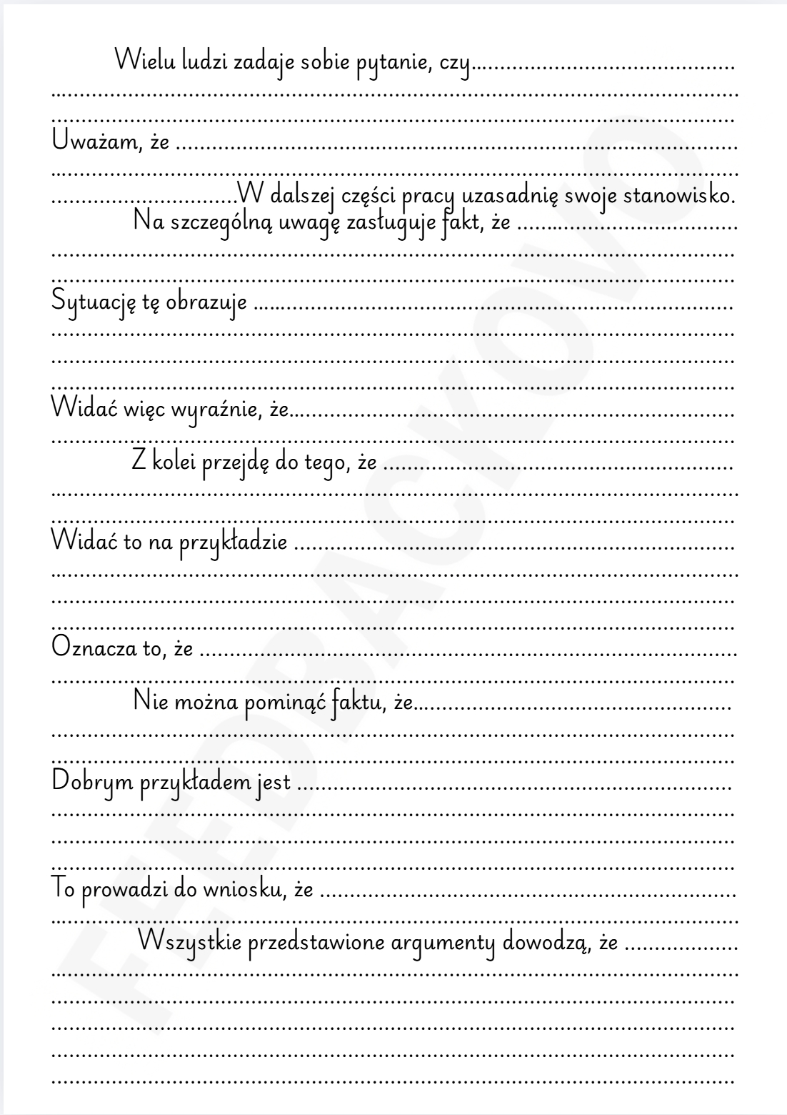 Uczeń pracuje na gotowych konstrukcjach zdań, które wprowadzają kolejne elementy wypowiedzi (np. wstęp, argument, rozwinięcie, zakończenie). Dzięki temu: