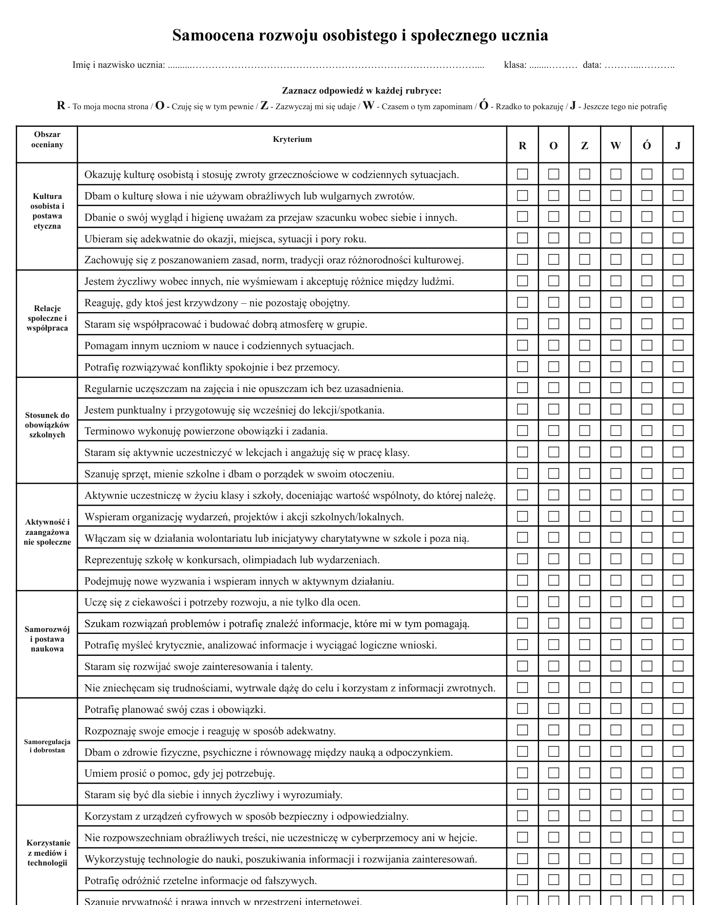 ✔ Kartę samooceny rozwoju osobistego i społecznego ucznia