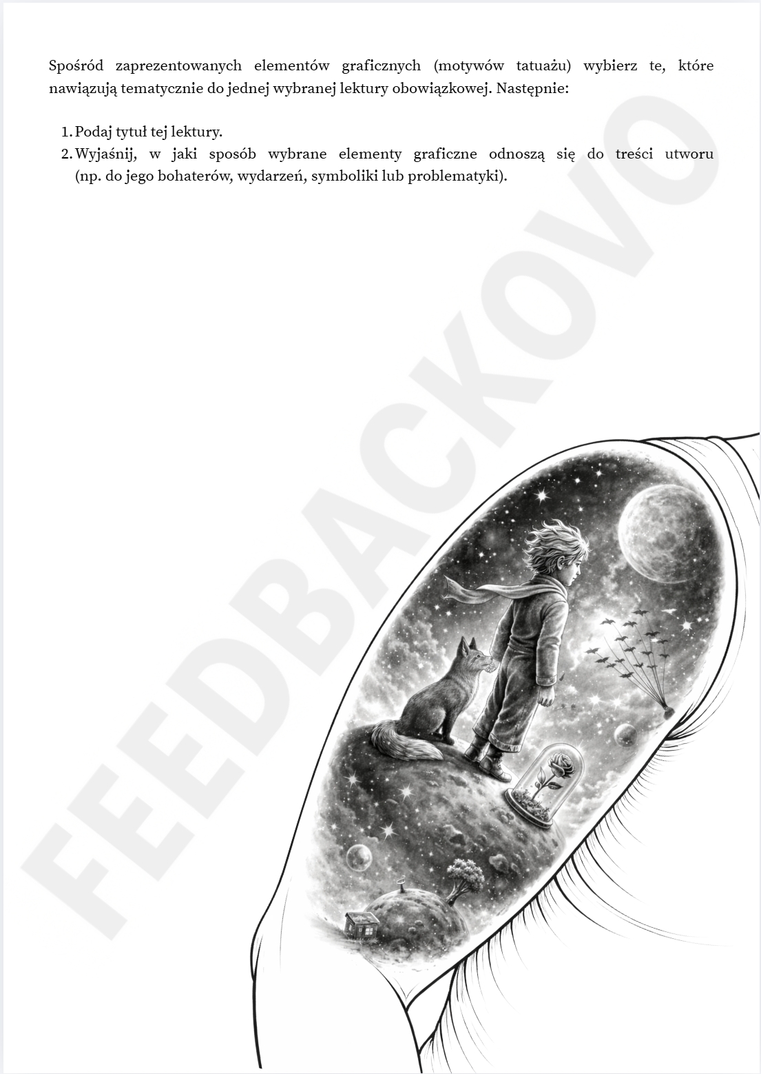 Ten materiał to kreatywne podejście do pracy z lekturą — z humorem, dystansem i konkretnym pomysłem. Inspiracją są graficzne zadania znane z egzaminu ósmoklasisty, które łączą wykorzystanie wiedzy z lektury z elementami wizualnymi nawiązującymi do jej treści, symboliki, motywów i znaczeń. To zadania, przy których można nie tylko się uczyć, ale też zwyczajnie dobrze bawić.