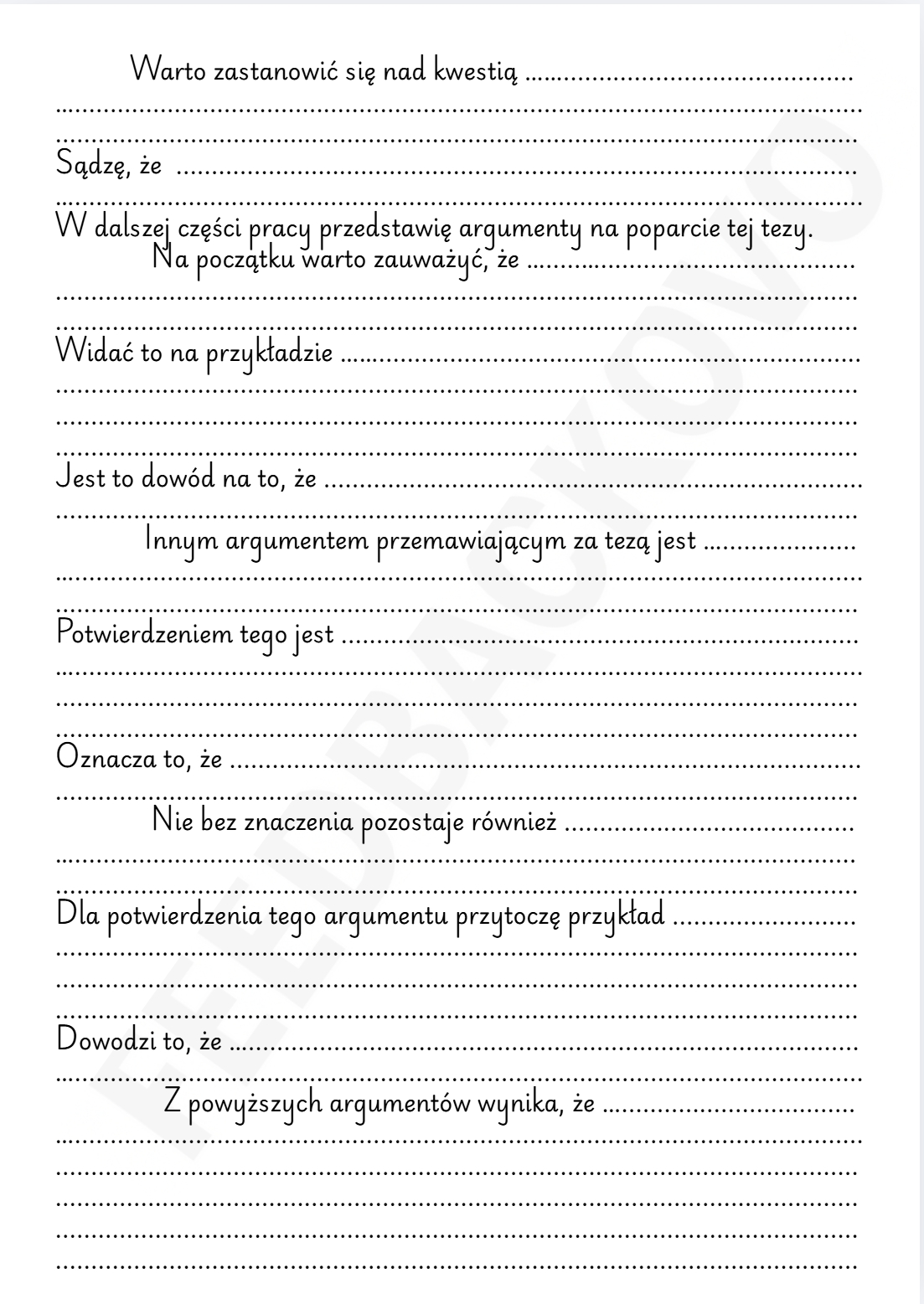 To zestaw 3 kart pracy z lukami do uzupełnienia, który prowadzi ucznia przez cały proces tworzenia rozprawki z tezą. Materiał został zaprojektowany tak, aby w uporządkowany i czytelny sposób pokazać strukturę wypowiedzi argumentacyjnej oraz pomóc uczniowi samodzielnie ją odtworzyć.