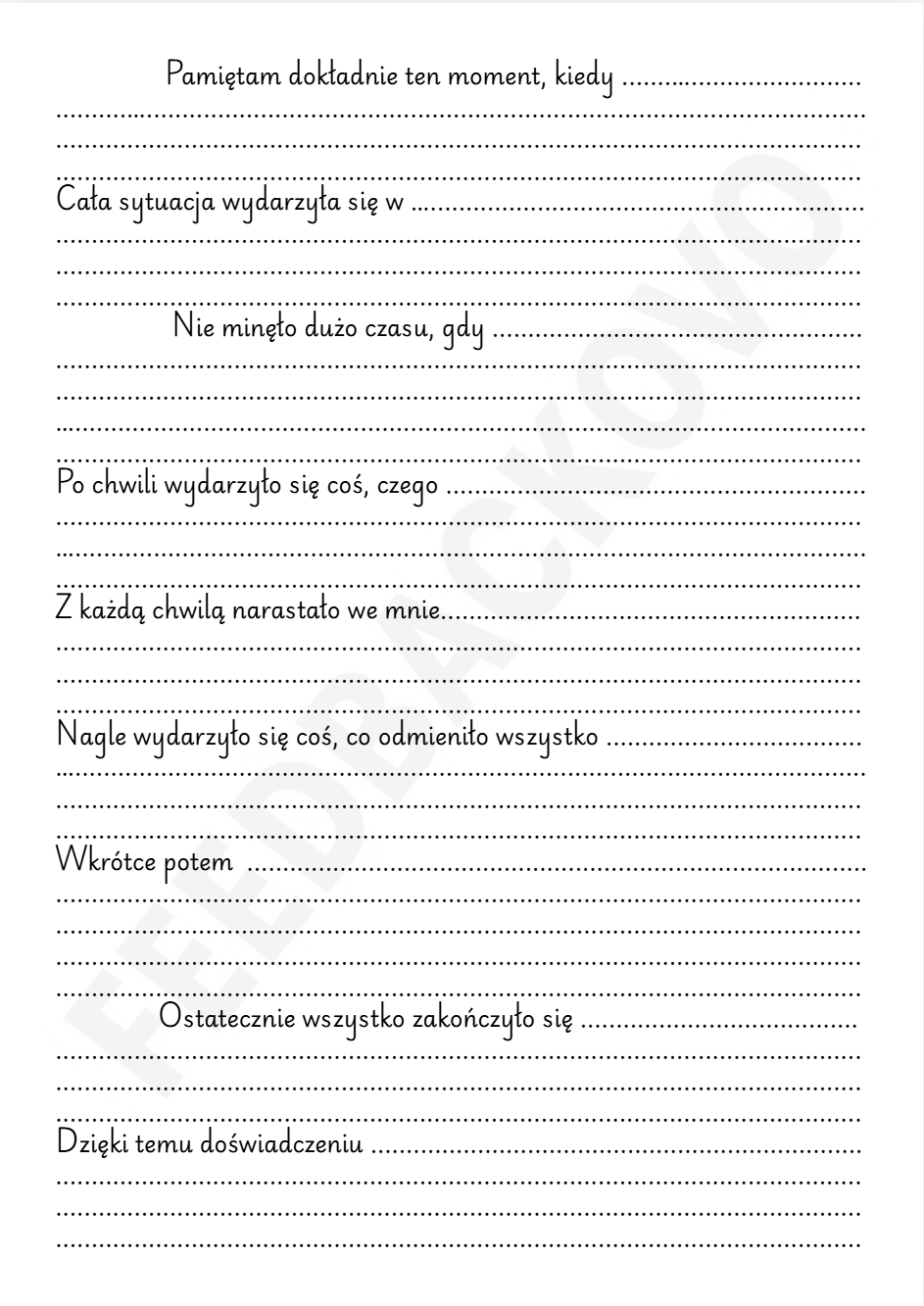Karty obejmują wszystkie kluczowe elementy opowiadania. Uczeń pracuje na gotowych początkach zdań, które ułatwiają rozpoczęcie pisania i prowadzenie narracji.