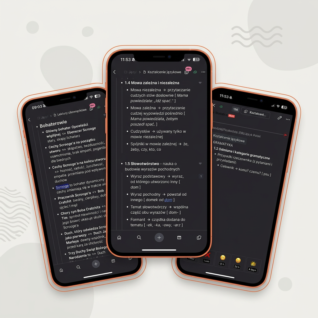 ✅ 3 moduły tematyczne (lektury, literatura, język) ✅ System Fiszki 2.0 + konfiguracja RemNote krok po kroku ✅ Dożywotni dostęp — bez subskrypcji, bez ukrytych opłat ✅ Działa na telefonie, tablecie i komputerze