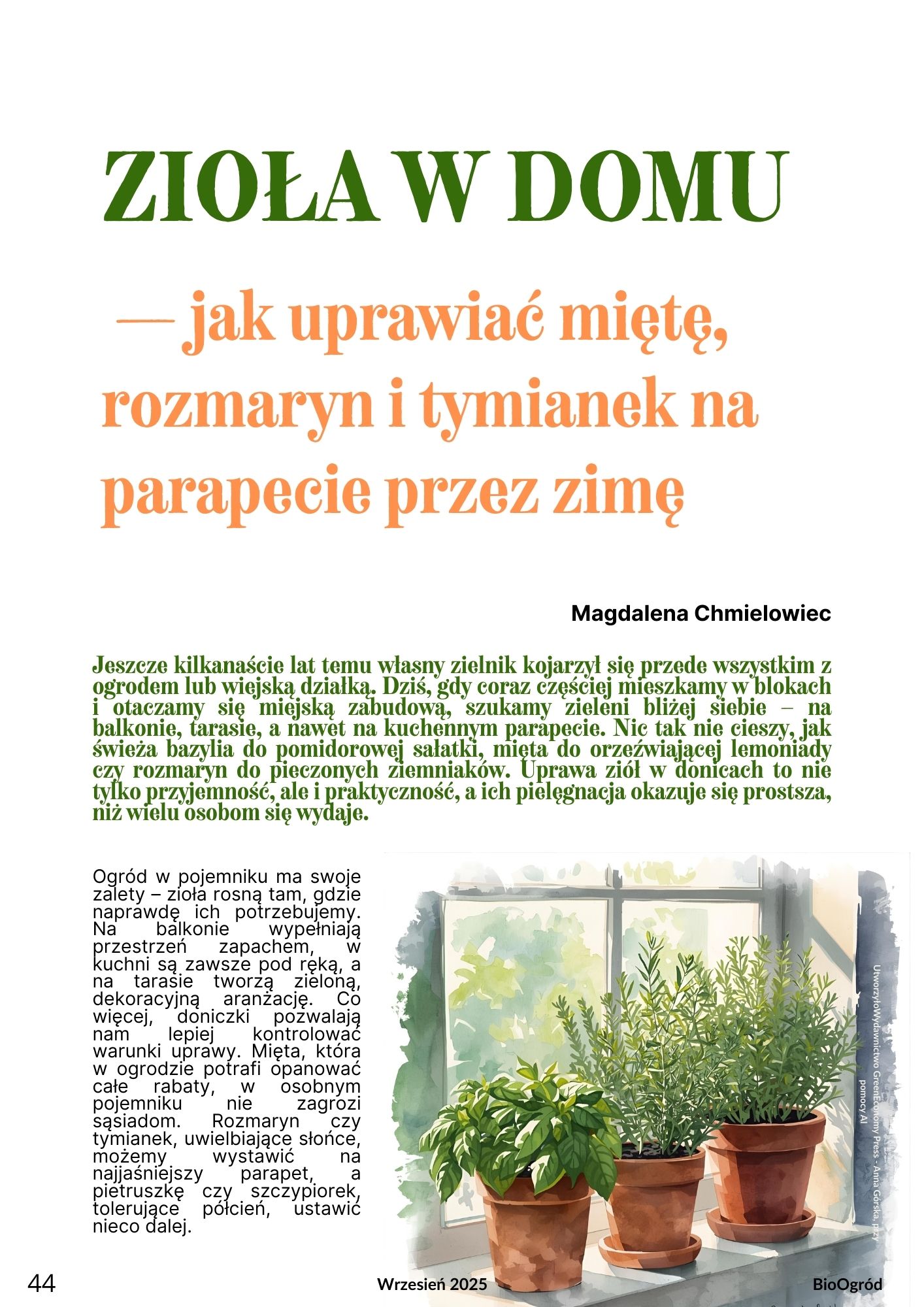 W tym numerze pokażę Ci, jak krok po kroku zadbać o ogród we wrześniu, jak siać sałaty ozime, czosnek i cebulę, oraz jak tchnąć drugie życie w grządki po zbiorach. Dowiesz się, jak naturalnie przechowywać owoce i warzywa, a także poznasz sekrety ziół na zimę – mięty, rozmarynu i tymianku uprawianych na parapecie. Odkryjesz, jak prowadzić ogród z odzysku i wdrażać ekologiczne sposoby recyklingu, a także zagłębisz się w fascynującą historię permakultury Billa Mollisona i Davida Holmgrena. Na deser czeka wyjątkowy wywiad z Michałem Łabuzem o hodowli kur ozdobnych rasy Feniks!