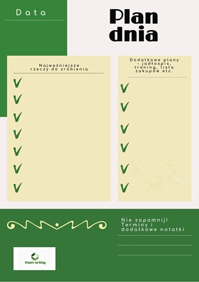 Ten planner dzienny pozwoli Ci zaplanować czynności do wykonania na każdy dzień. Możesz go użyć, jeśli nie potrzebujesz zapisywać terminów, bo nie jest to planner godzinowy, ale możesz zanotować właściwie co chcesz. Ułatw sobie życie i pracę z tym super plannerem!