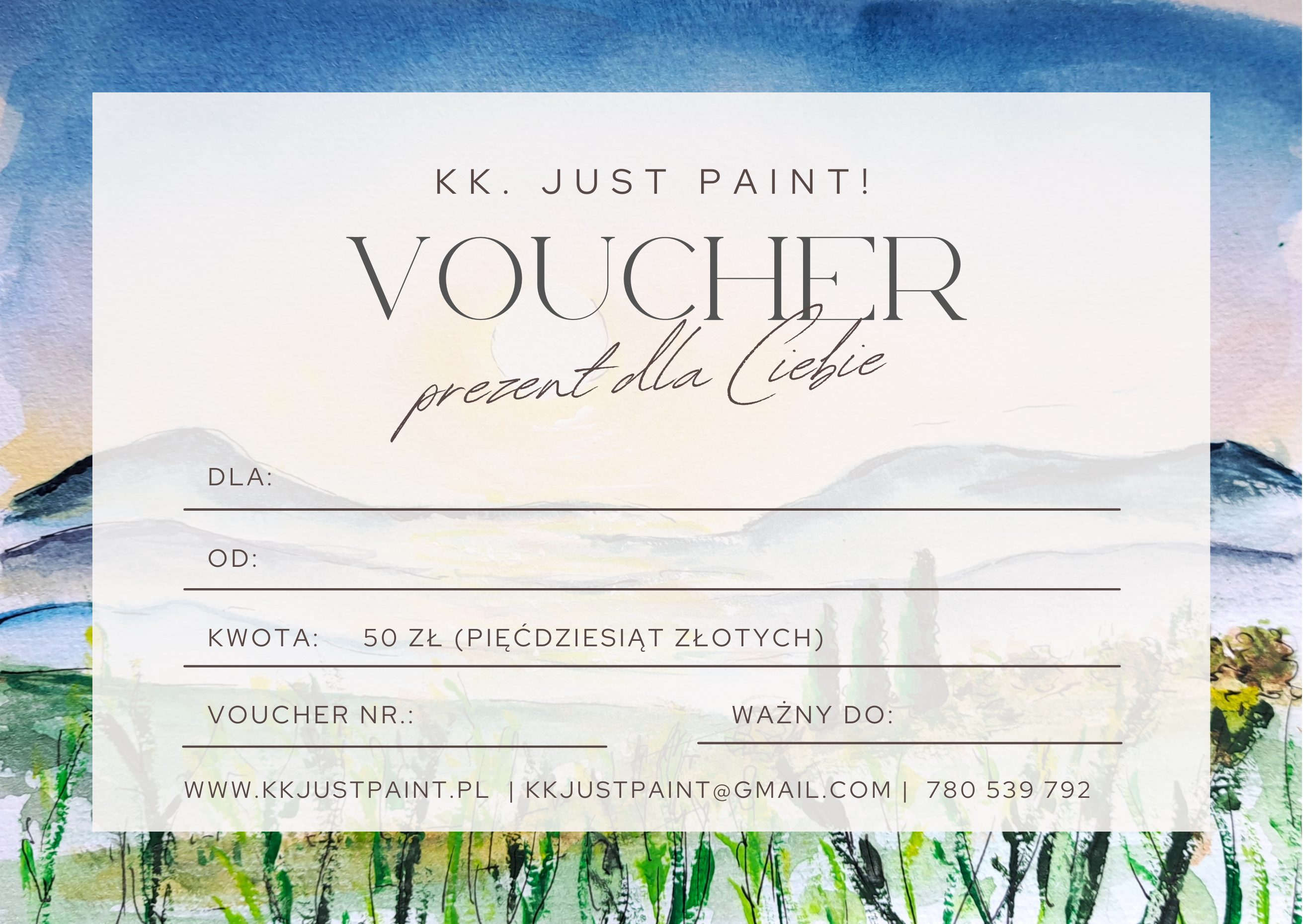 Voucher sklep artystyczny obrazy akwarela olej na płótnie biżuteria gadżety 50złVoucher sklepu artystycznego obrazy akwarela olej na płótnie biżuteria gadżety 50zł50,00 zł -