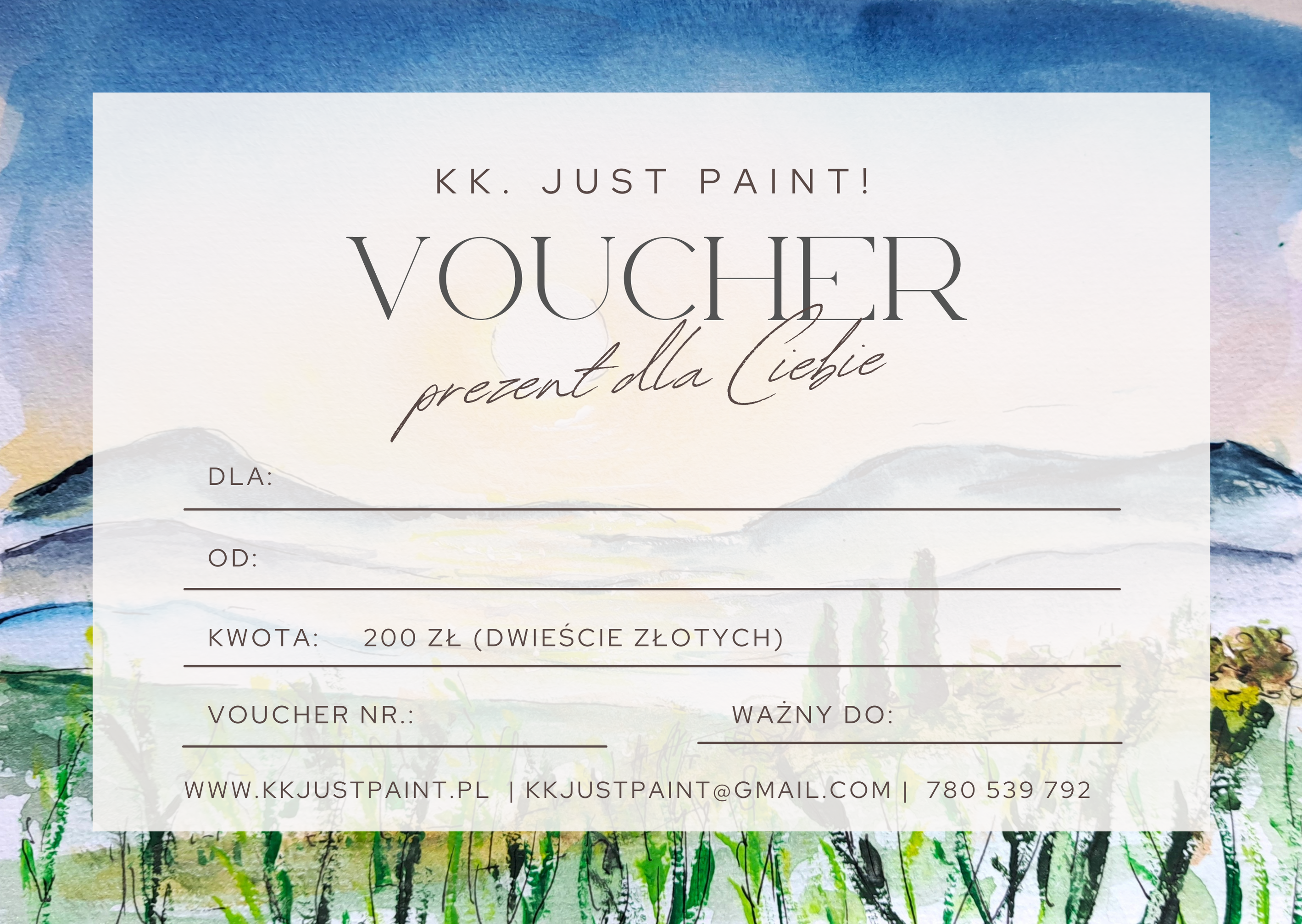 Voucher sklep artystyczny obrazy akwarela olej na płótnie biżuteria gadżety 200złVoucher sklep artystyczny obrazy akwarela olej na płótnie biżuteria gadżety 200zł200,00 zł -