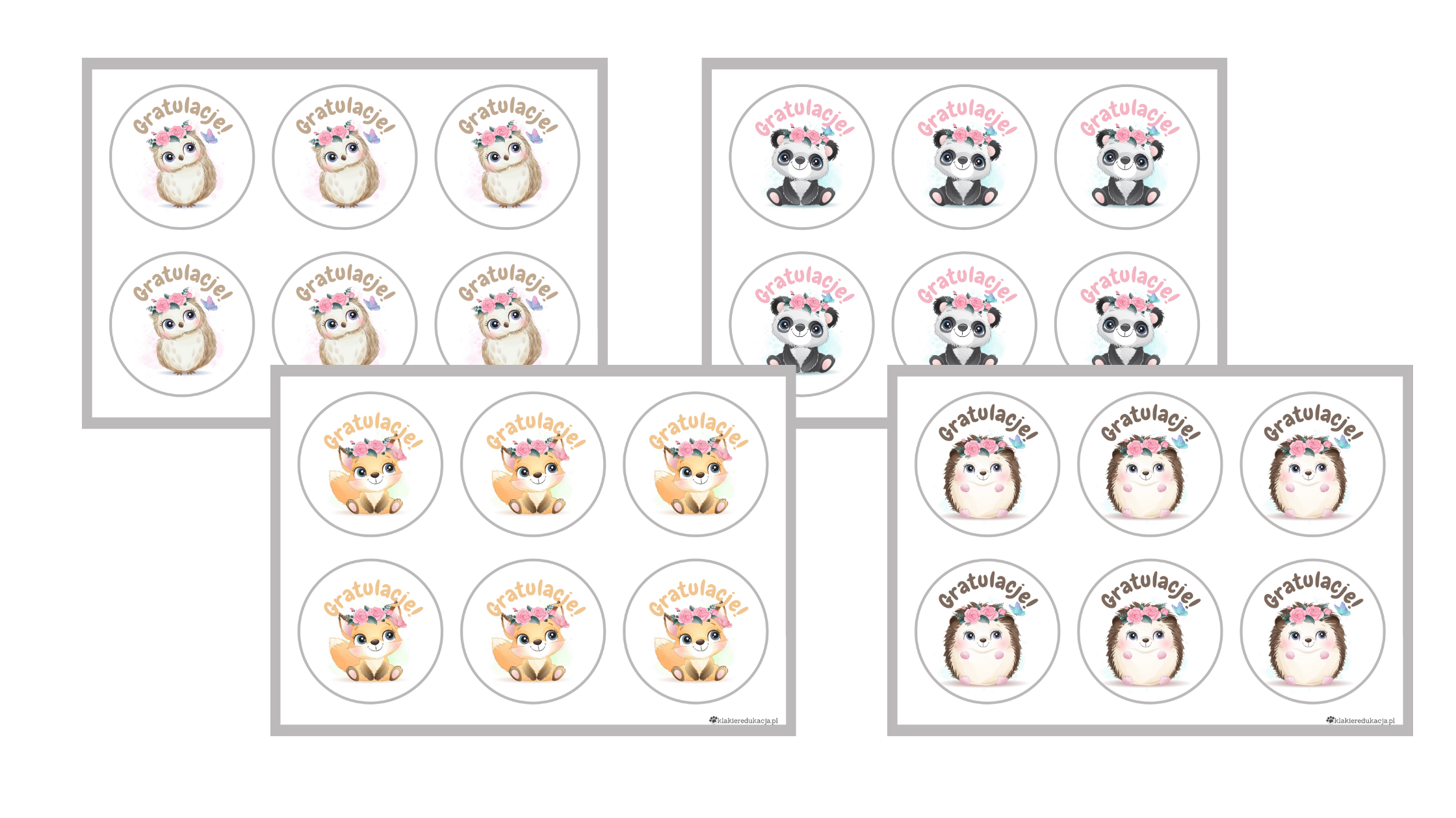 Zestaw odznaki Gratulacje- zawiera cztery wzory z grafikami zwierząt, które można wykorzystać jako: