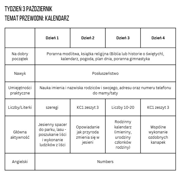 Plan przygotowany jest na 26 tygodni - od początku października do końca czerwca. W każdym tygodniu przewidziałam: