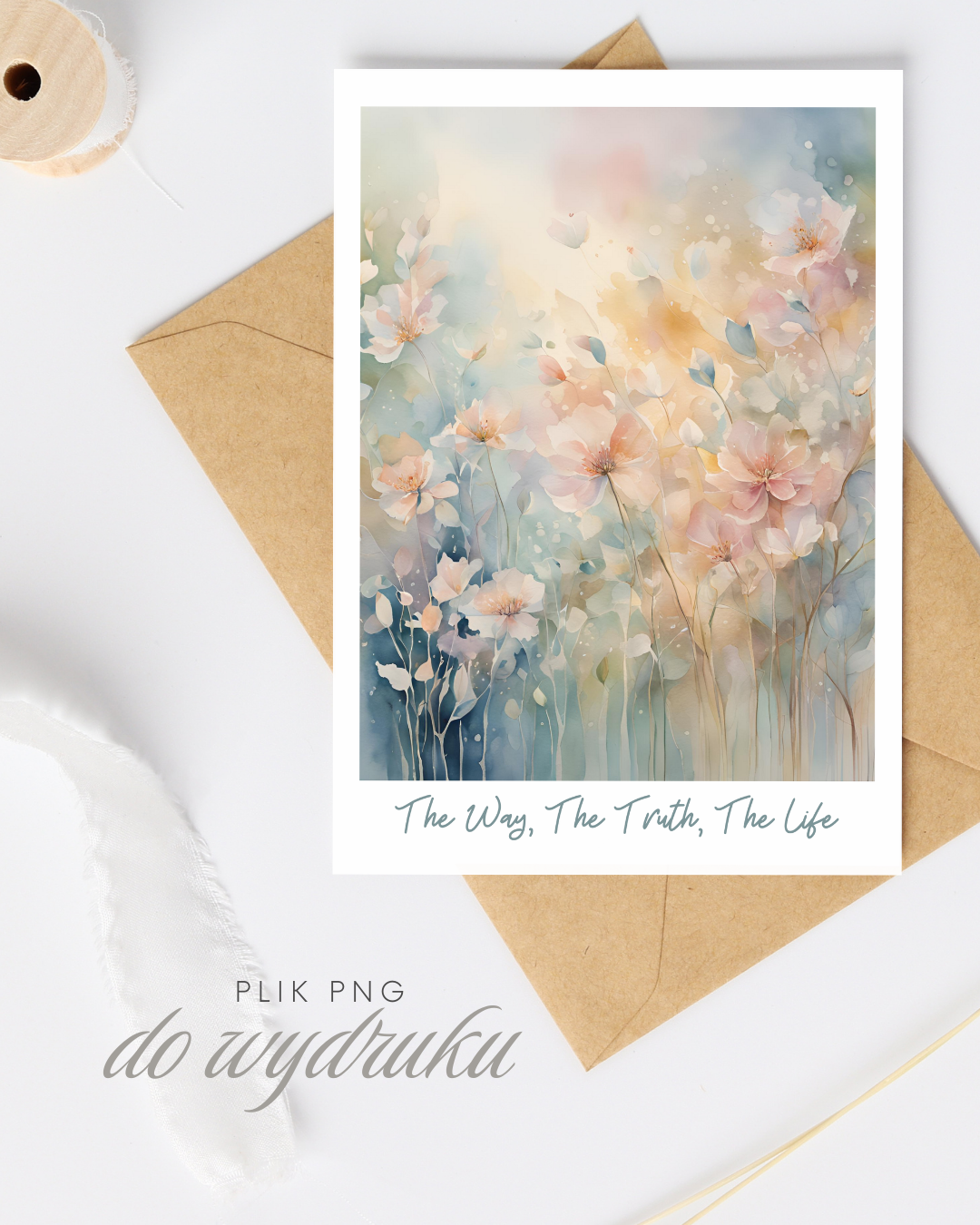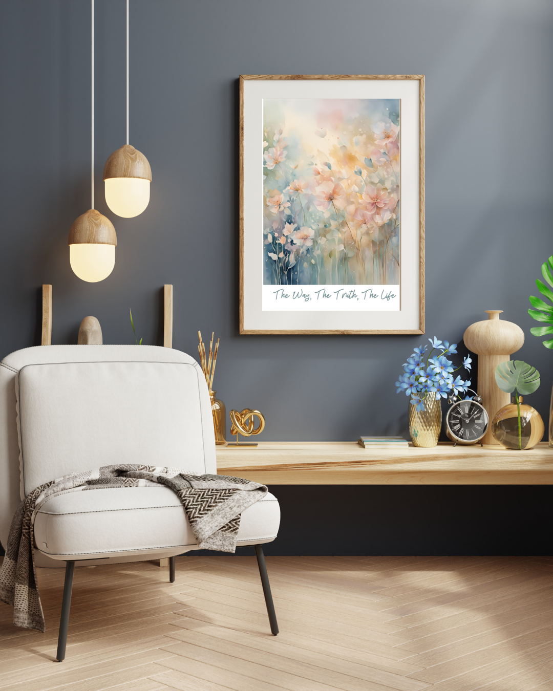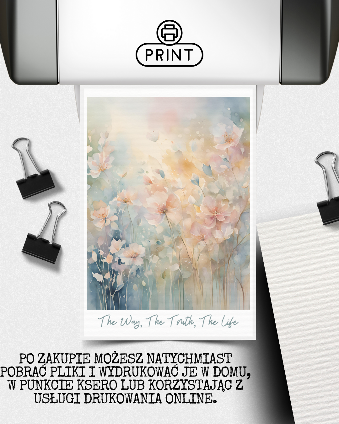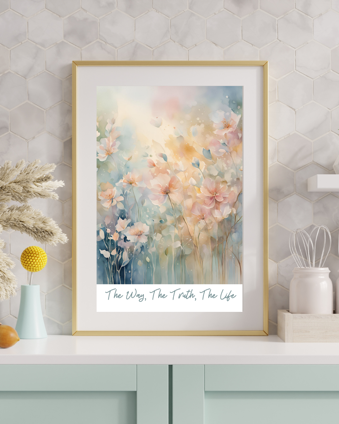 Subtelny, autorski plakat z ponadczasowym przesłaniem „The Way, The Truth, The Life” — słowami, które prowadzą, uspokajają i pomagają odnaleźć właściwy kierunek. To delikatne, a jednocześnie głębokie przypomnienie o drodze wiary, prawdzie serca i życiu zakorzenionym w sensie.