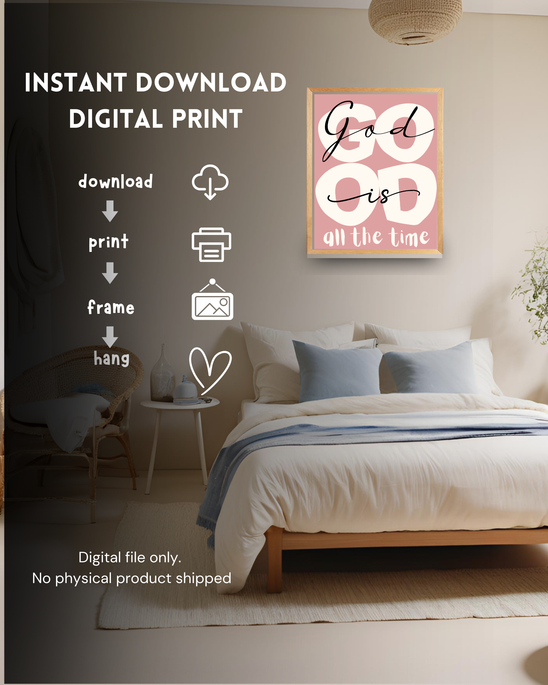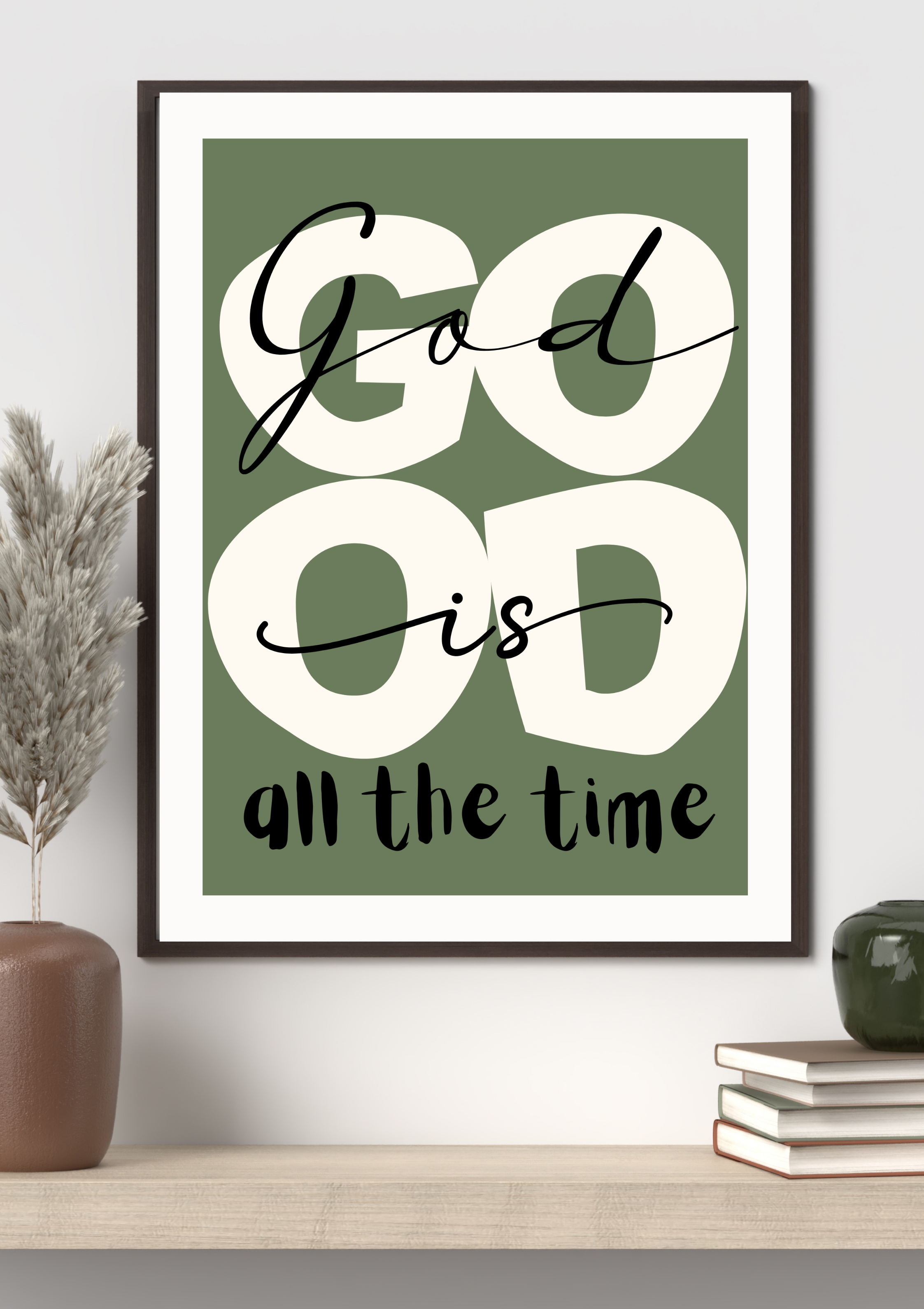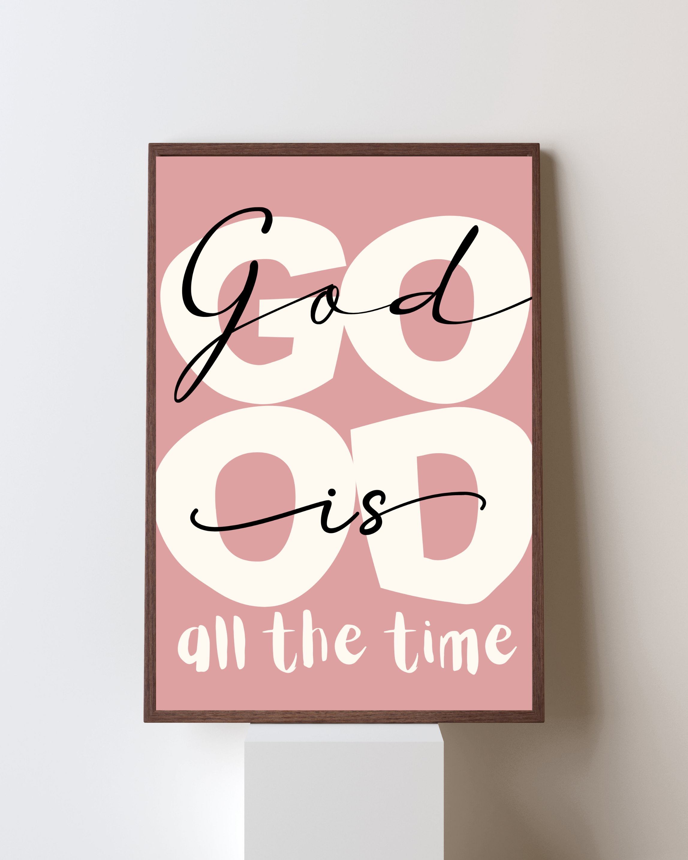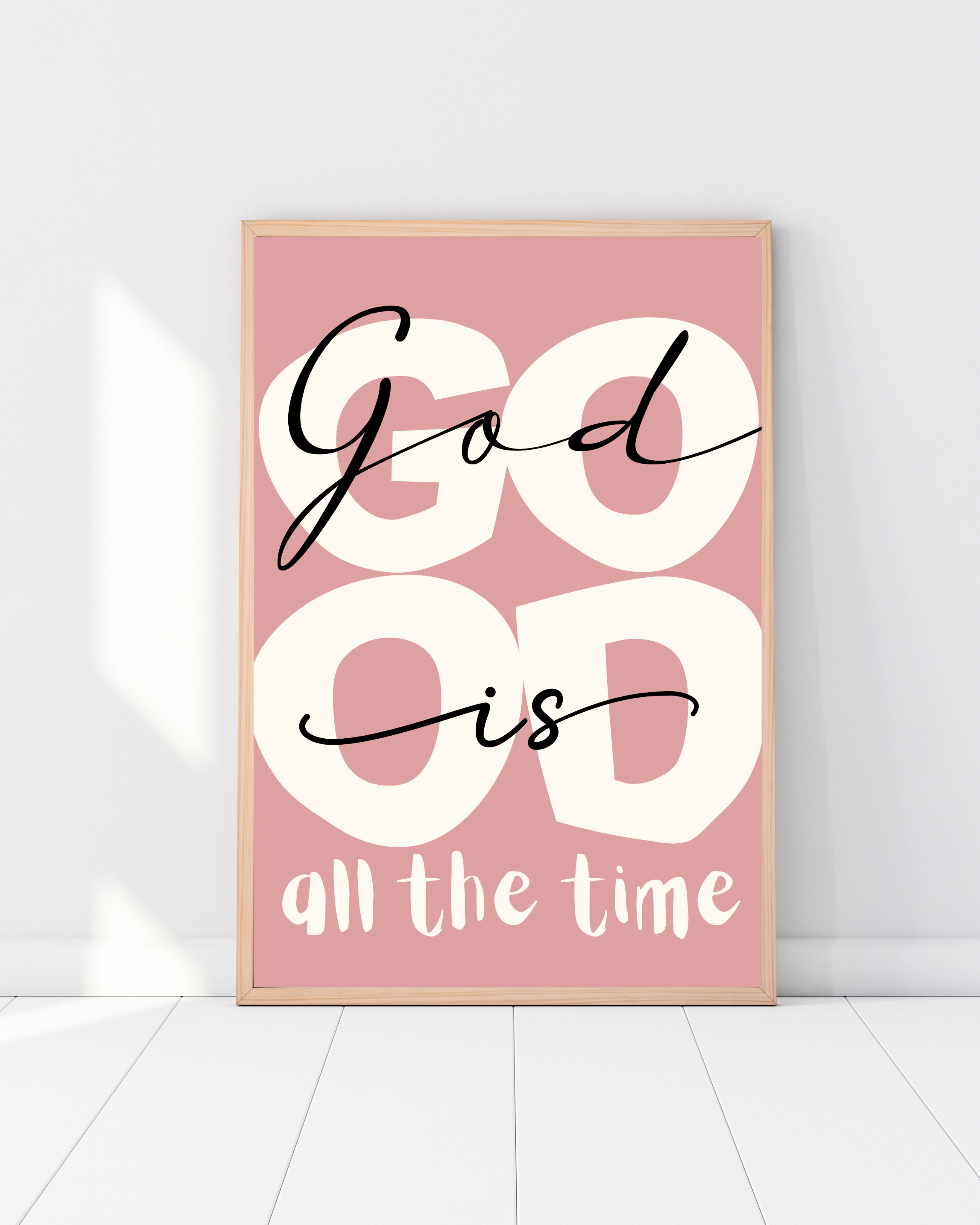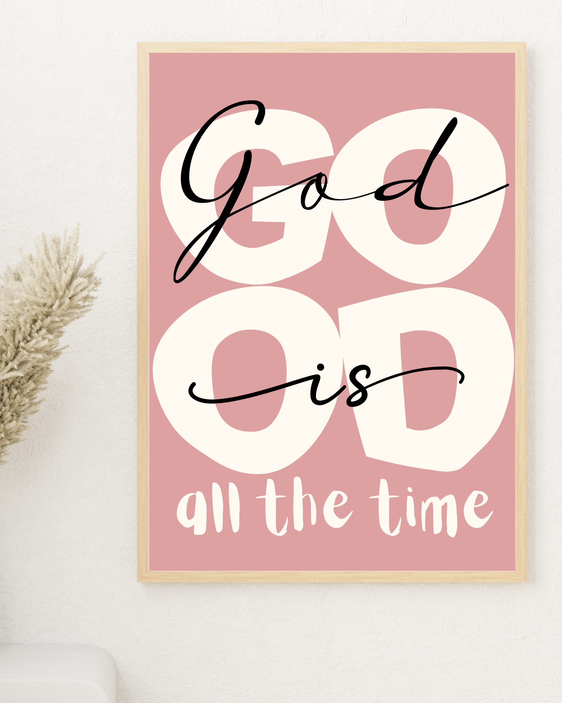 Nowoczesny, autorski plakat z pełnym nadziei i mocy przesłaniem: „God is good all the time”. Prosta forma i współczesna typografia łączą się tu z głęboką treścią, tworząc dekorację, która jednocześnie uspokaja, wzmacnia i przypomina o zaufaniu.