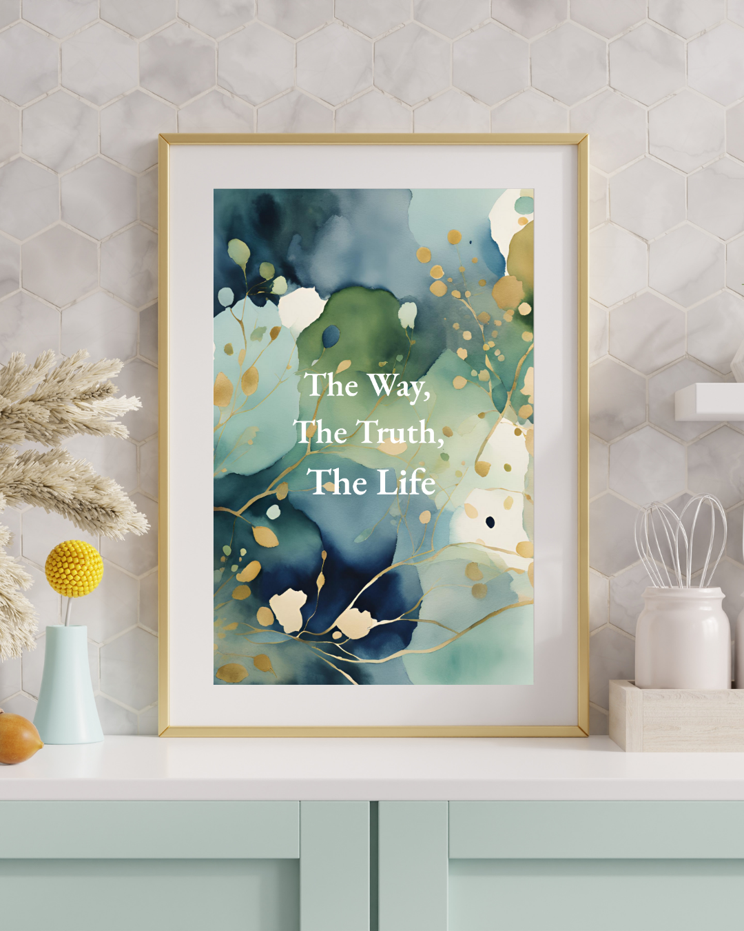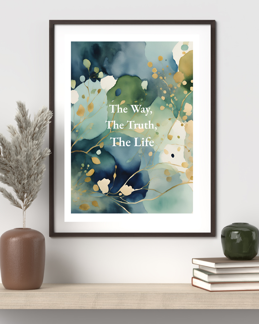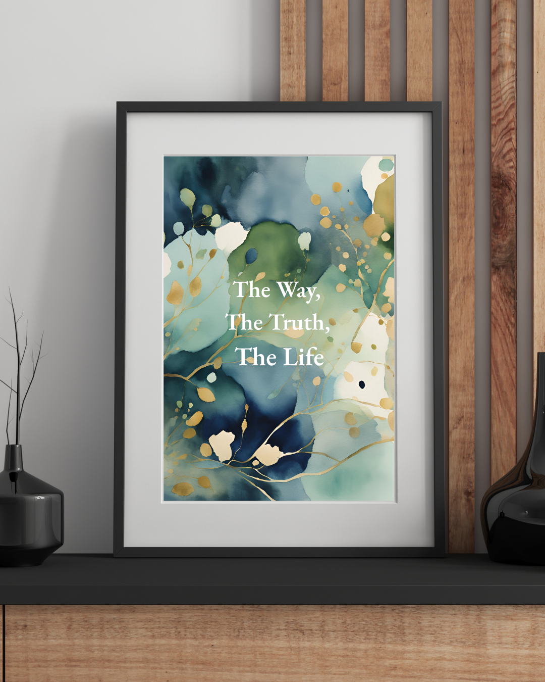 Subtelny, autorski plakat z ponadczasowym przesłaniem „The Way, The Truth, The Life” — słowami, które niosą światło, kierunek i wewnętrzny pokój. To delikatne, a jednocześnie głębokie przypomnienie o drodze wiary, prawdzie serca i życiu zakorzenionym w sensie.