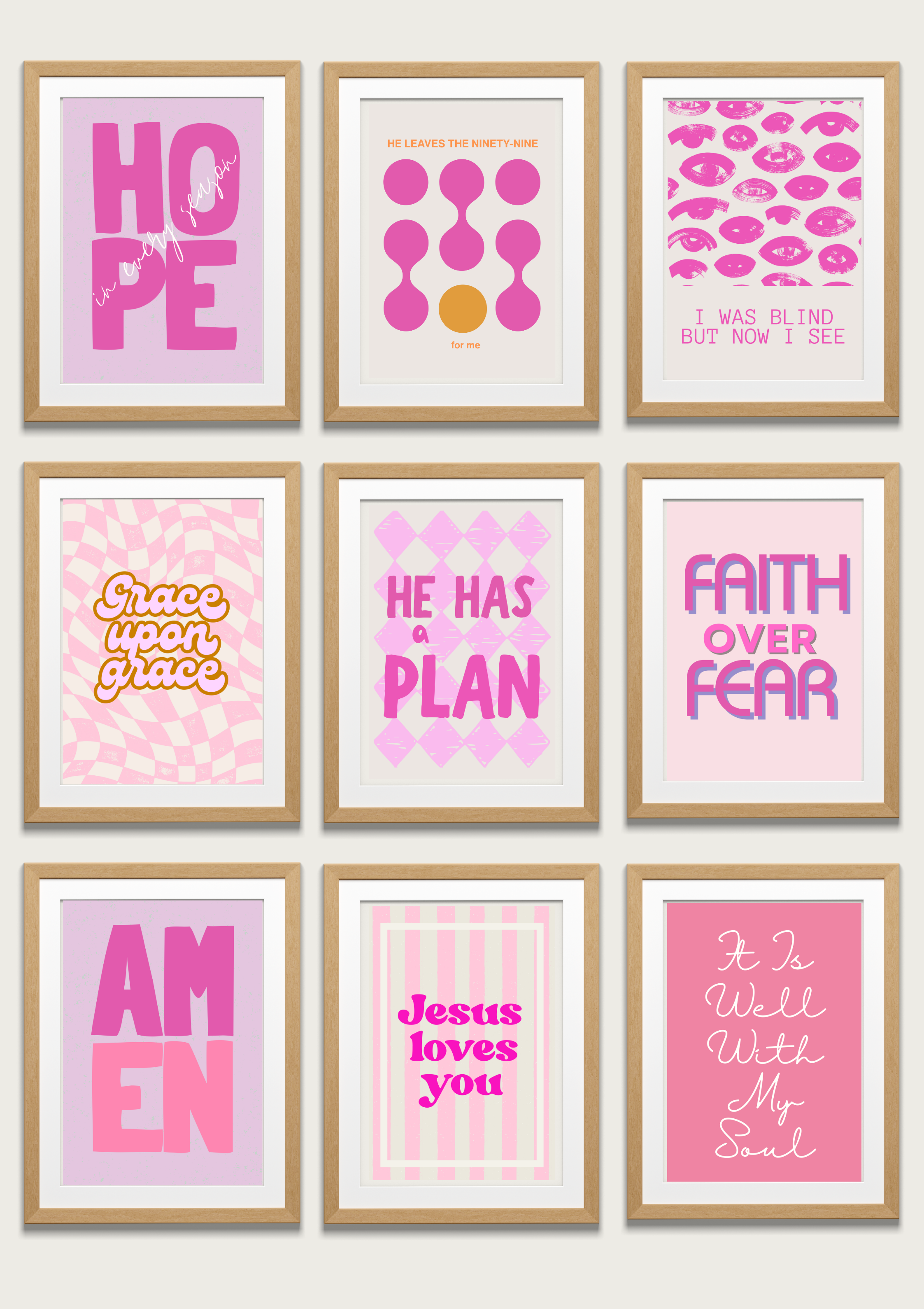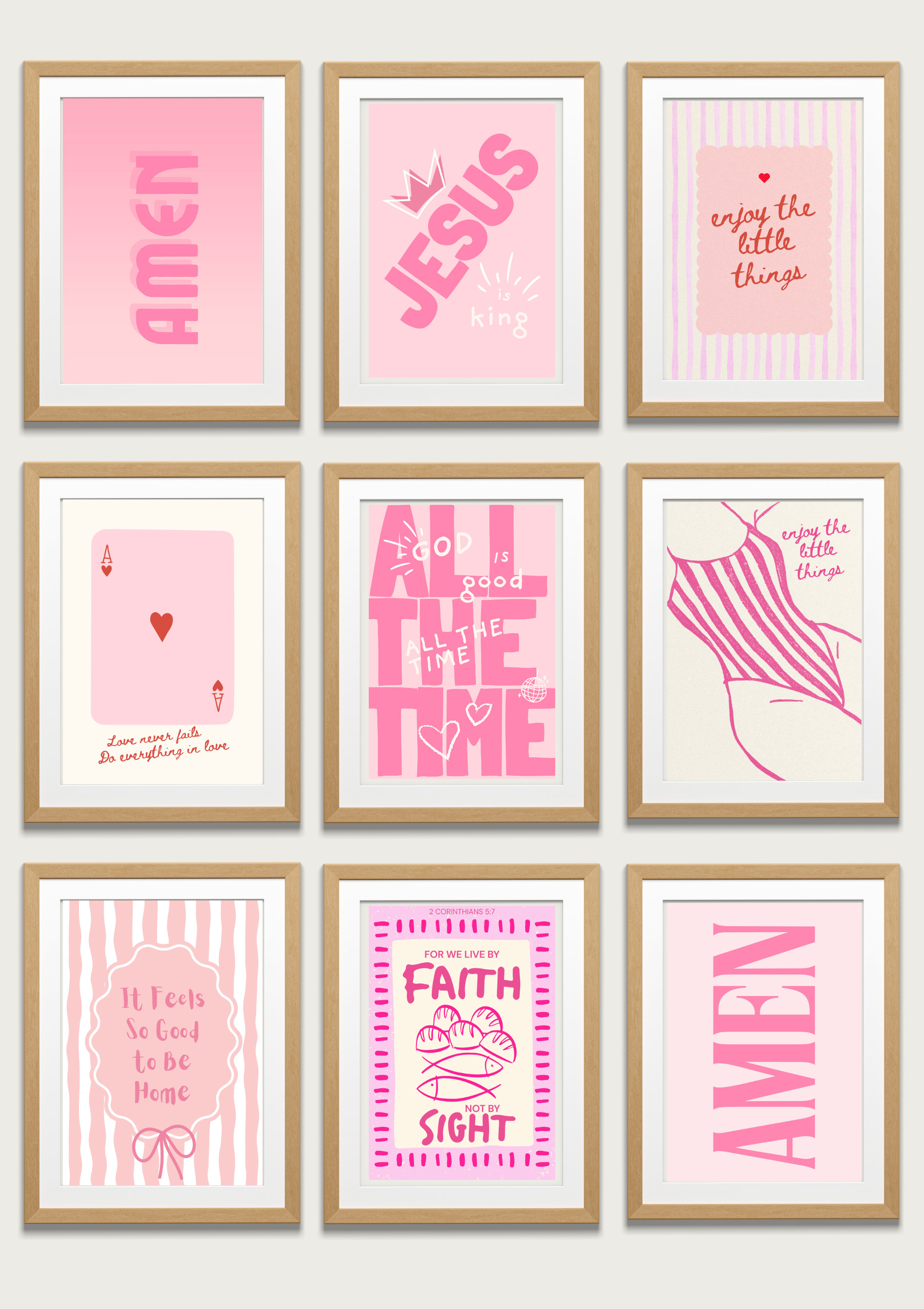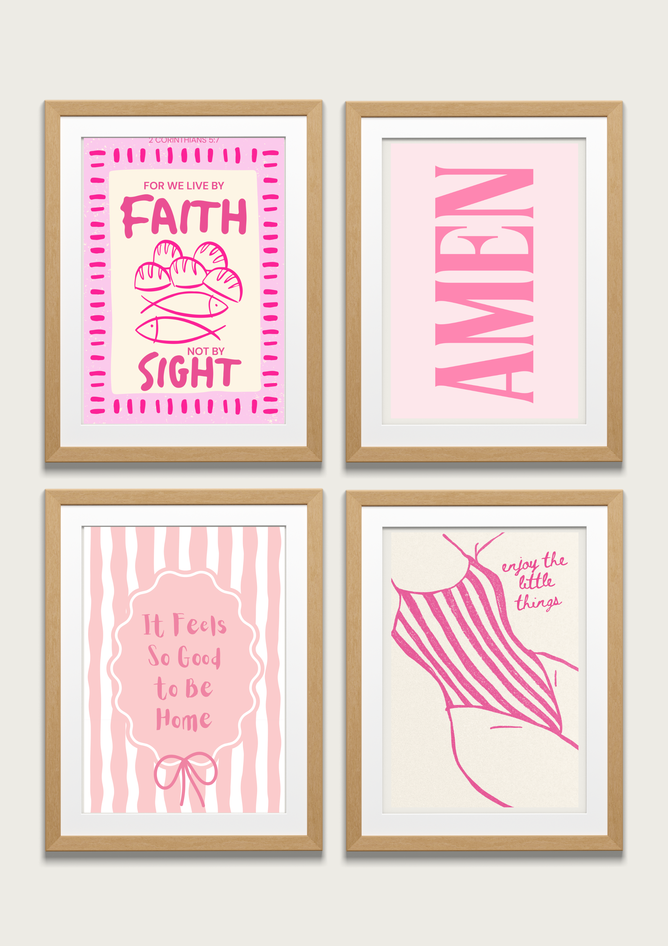 Kolekcja utrzymana jest w różowej, jasnej palecie kolorów, z lekką, harmonijną formą. To plakaty, które nie krzyczą, ale zostają — wprowadzają do wnętrza spokój, ciepło i pozytywne przesłanie.